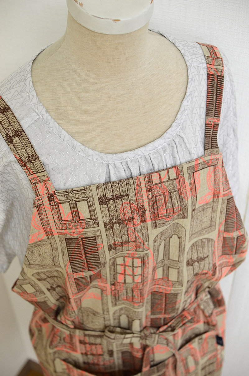 Fluorescent rabbits are layered over a variety of antique doors. This curious look is created with “Alice in Wonderland” slightly in mind…… As the design itself has a chic feel, a kitchen item like an apron would look great.