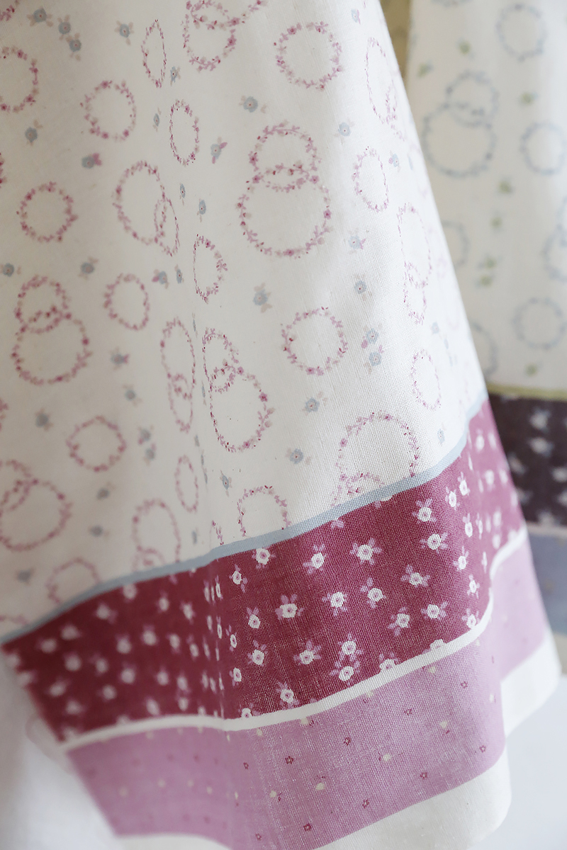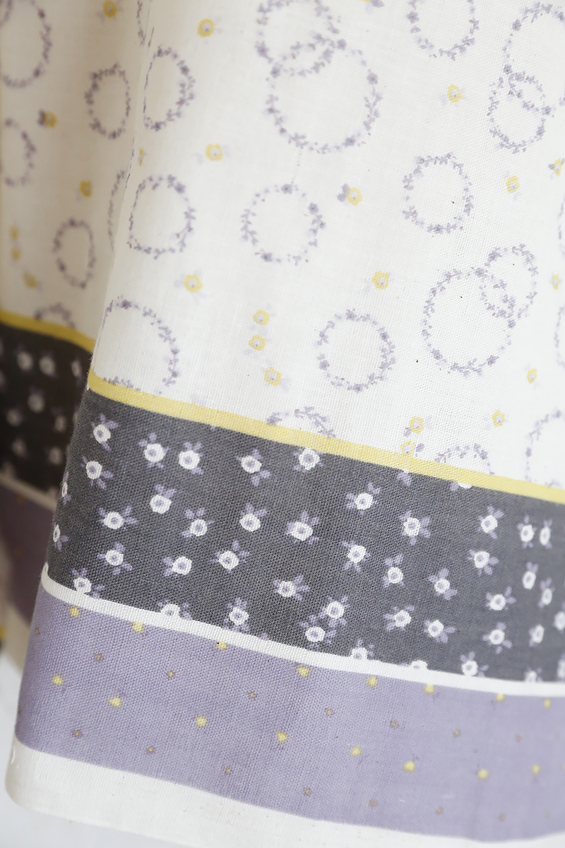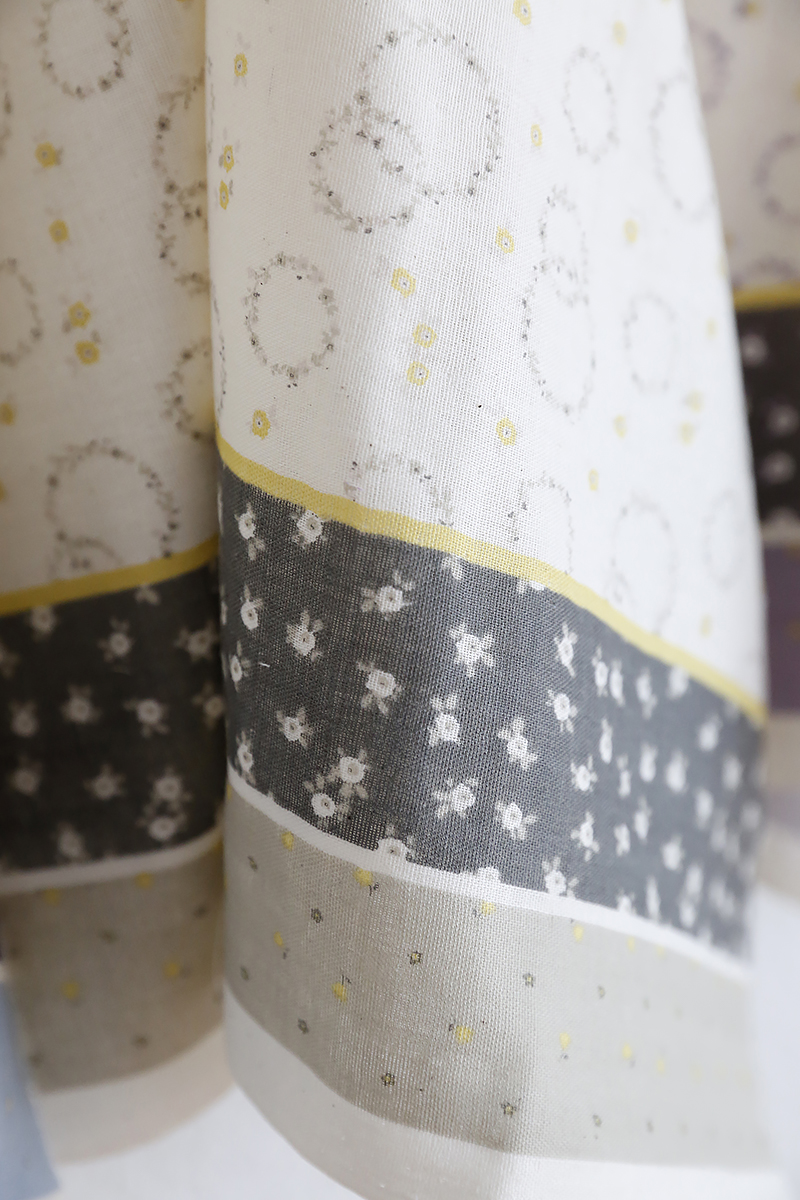 Circle Flower is a textile that was designed in an atelier in France. When printed on the double gauze material, it created a soft and lovely image. In contrast to the soft-toned overall design, two darker color borders are added to pull the design together. These borders will look really adorable as a hem for a dress or a skirt.