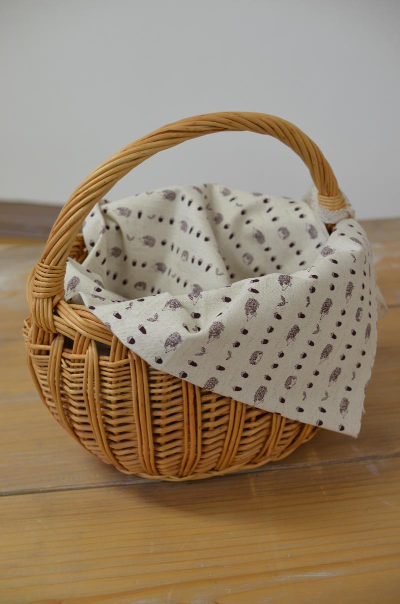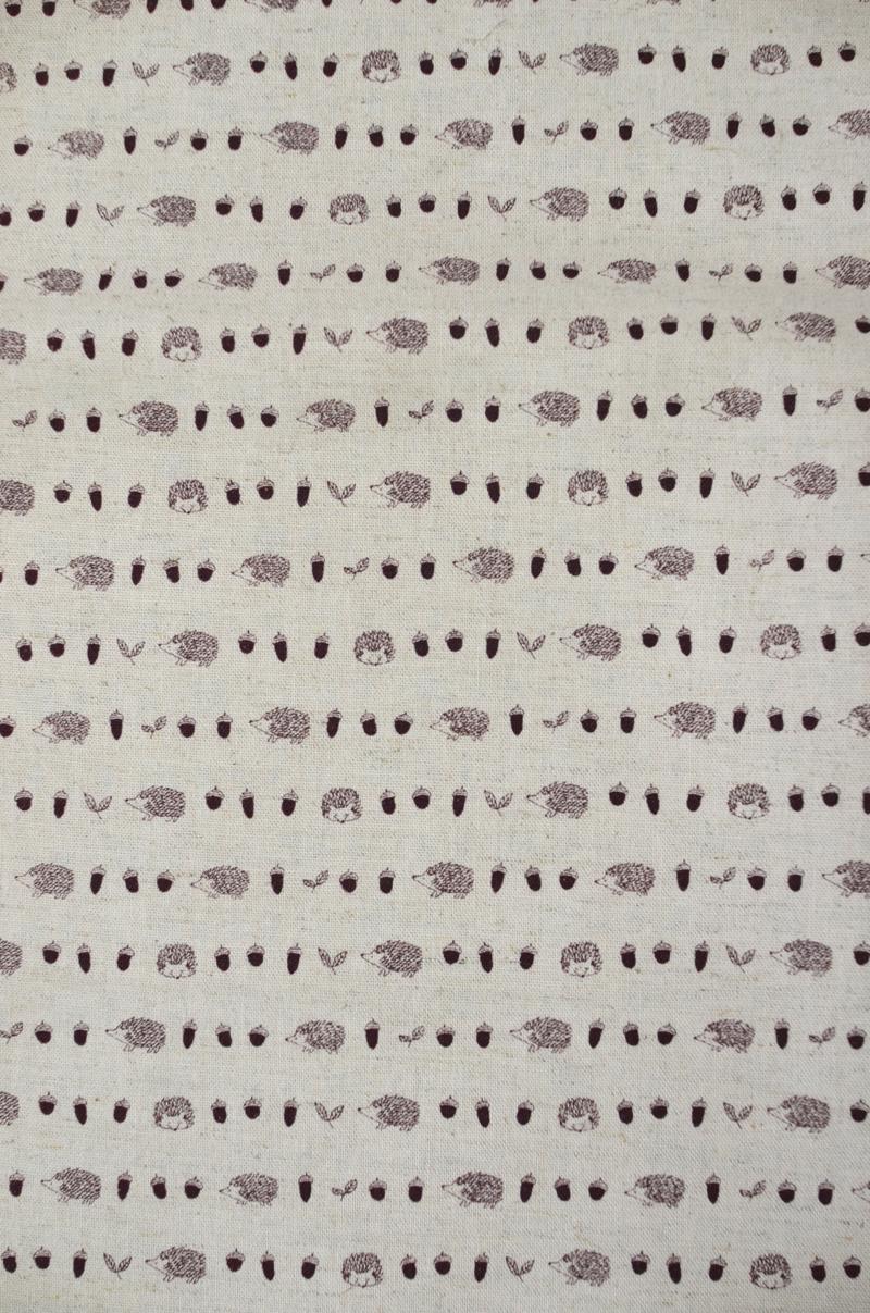 Hedgehogs and acorns line up to compose a border-like design. There is something simple about these motifs, which also reminds you of a Scandinavian wooden toy. Toned down smoky colors fit well for cute bags and small cases for adults.
