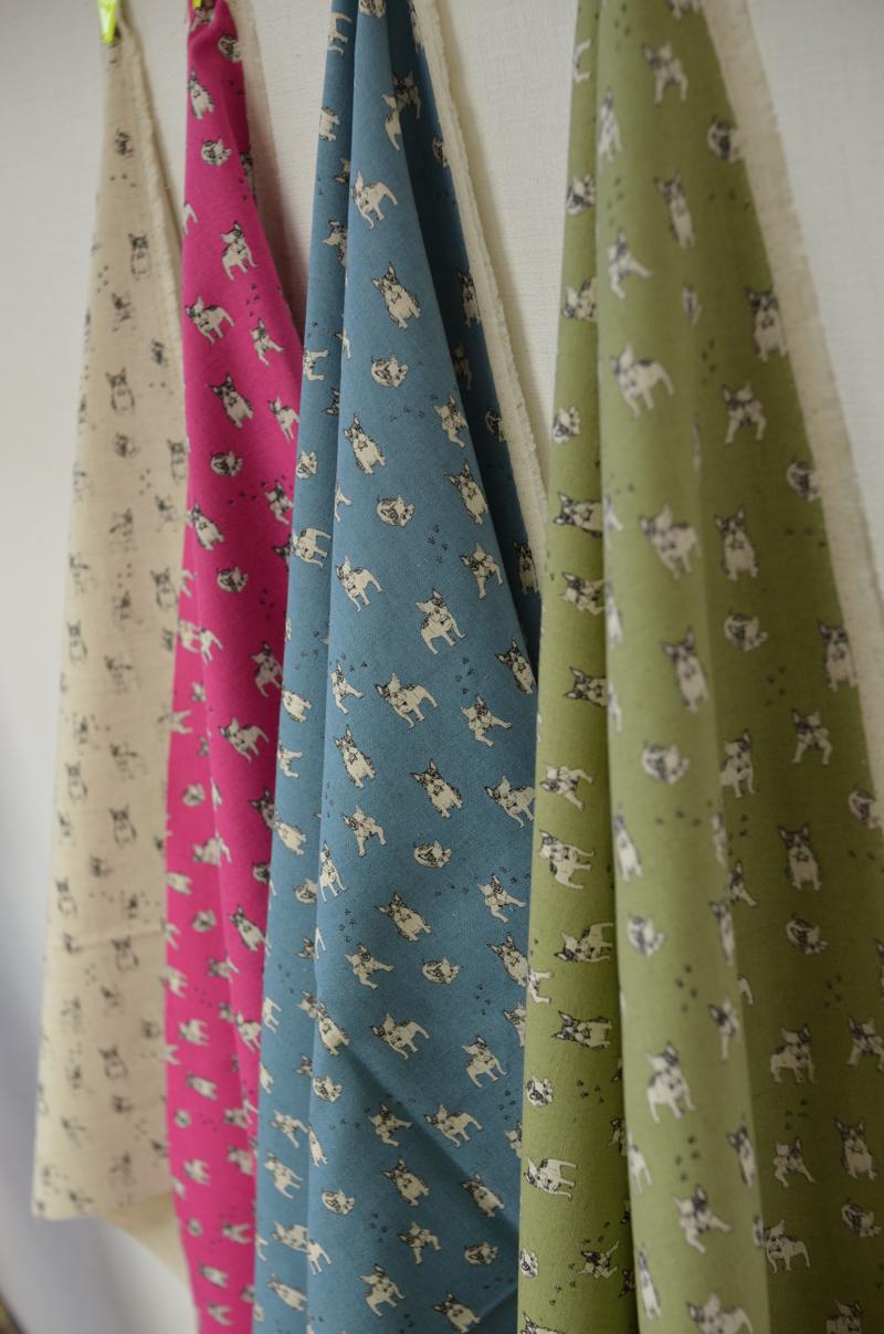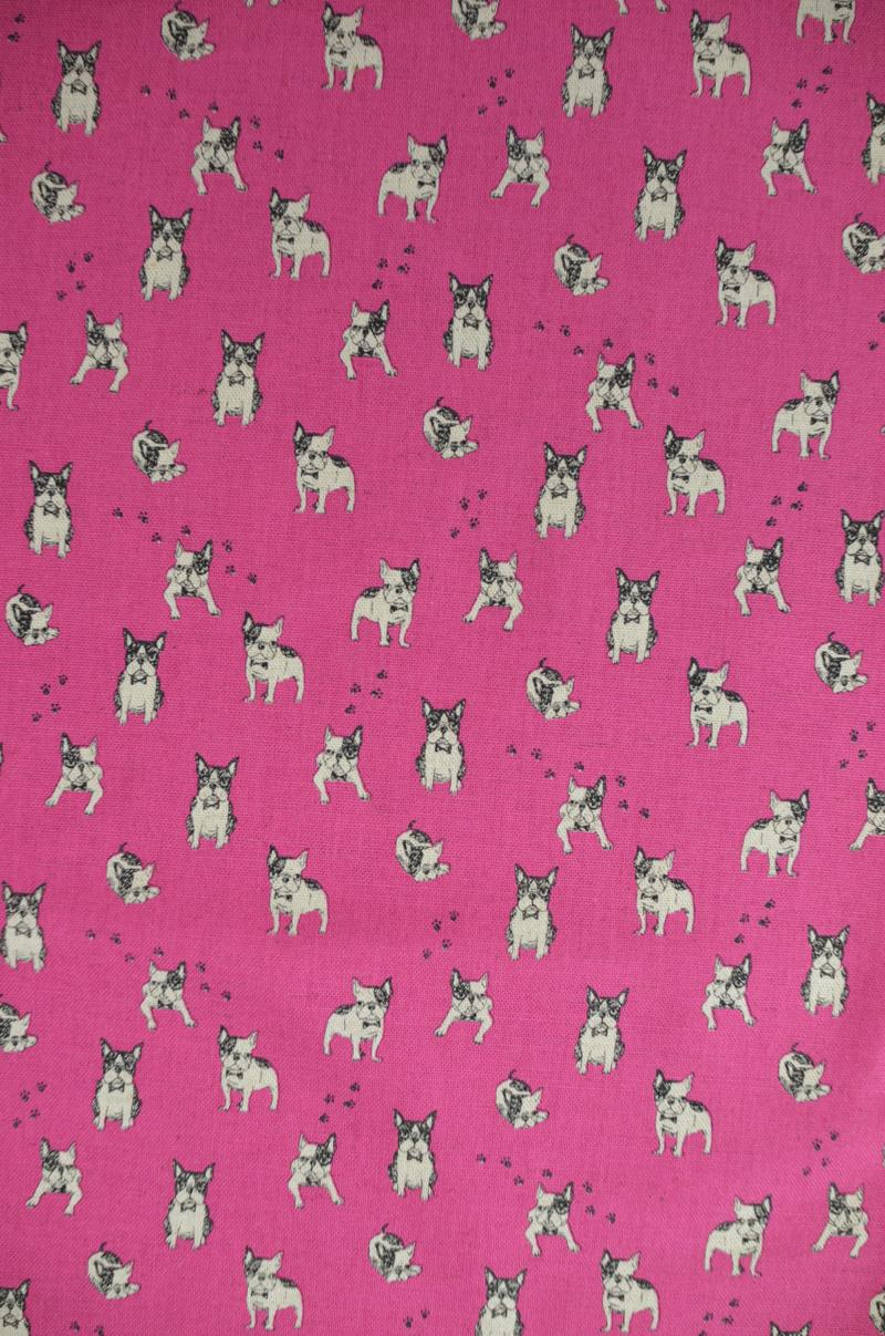 Bulldogs in various poses randomly cover the entire fabric. Slightly sulky looking faces are indescribably charming. Paw prints are scattered around as design accents.