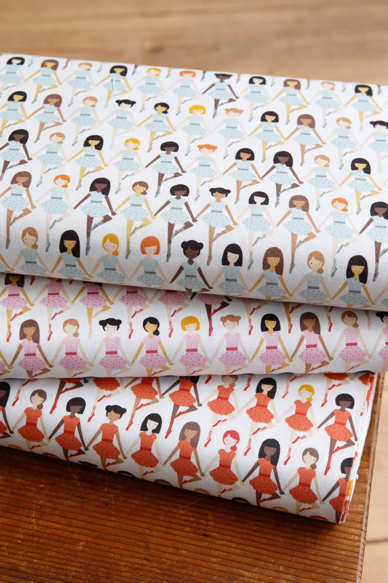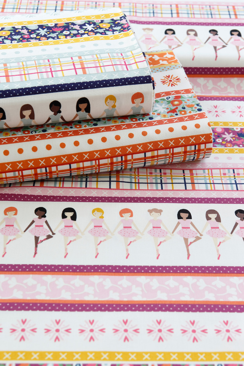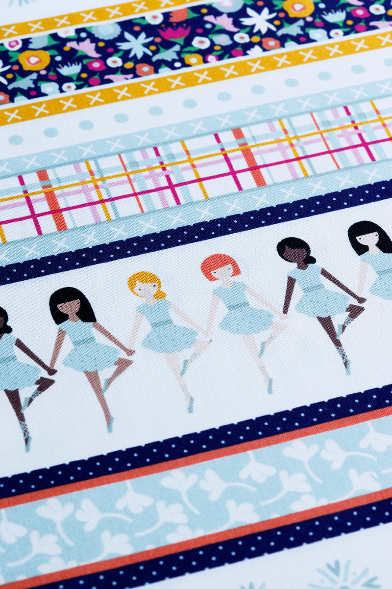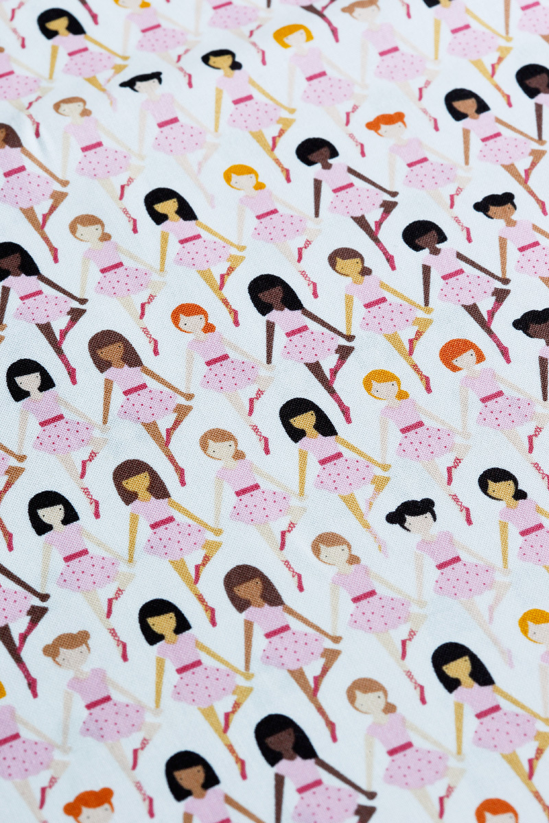 Woods continues that Rebecca has been a really big help for her to design and clean up the patterns. “It was really important to us to make sure that we represented girls all over the WORLD, because dancing is a universal language. I just love the concept of people coming together because of a common denominator. Isn’t it a neat idea? Becca and I worked for HOURS to make sure we had several different ethnicities represented in both the skin color and hair colors. It was hard work, but it was really important to us. I hope, as people see this fabric, and have dancers that they know and love, they’ll be able to pick out one of the girls that resembles them.”