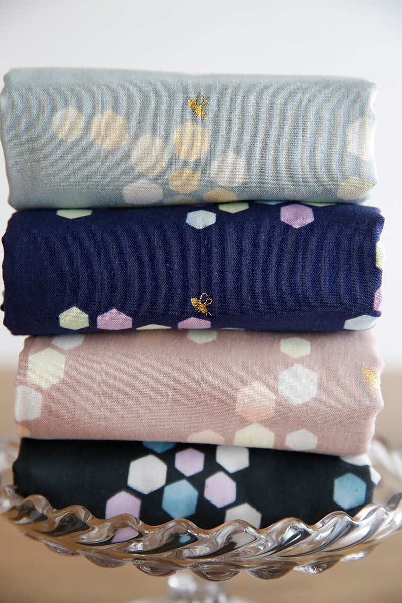 Looking closely, you will notice a beehive design with aligned hexagonal shapes and occasional flying bees in gold lamé. A matching outfit in different colors will be stylish, like a child’s dress in a light color and a dress for an adult in a dark color.