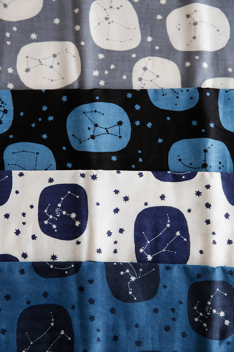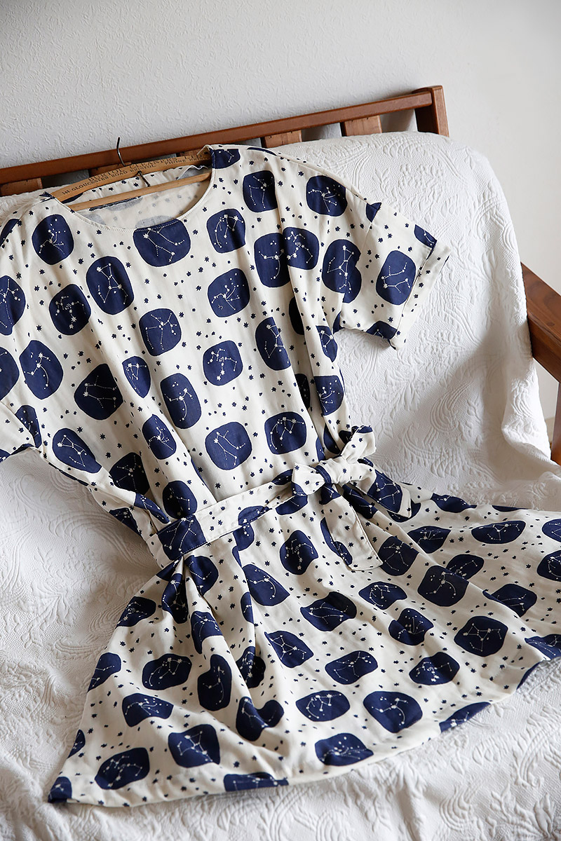 Stars are flying around as if they were stamped onto the fabric. The plain colors are carefully chosen to represent the constellations in the evening sky. Why not plan going out in a simple one-piece dress made from this fabric?