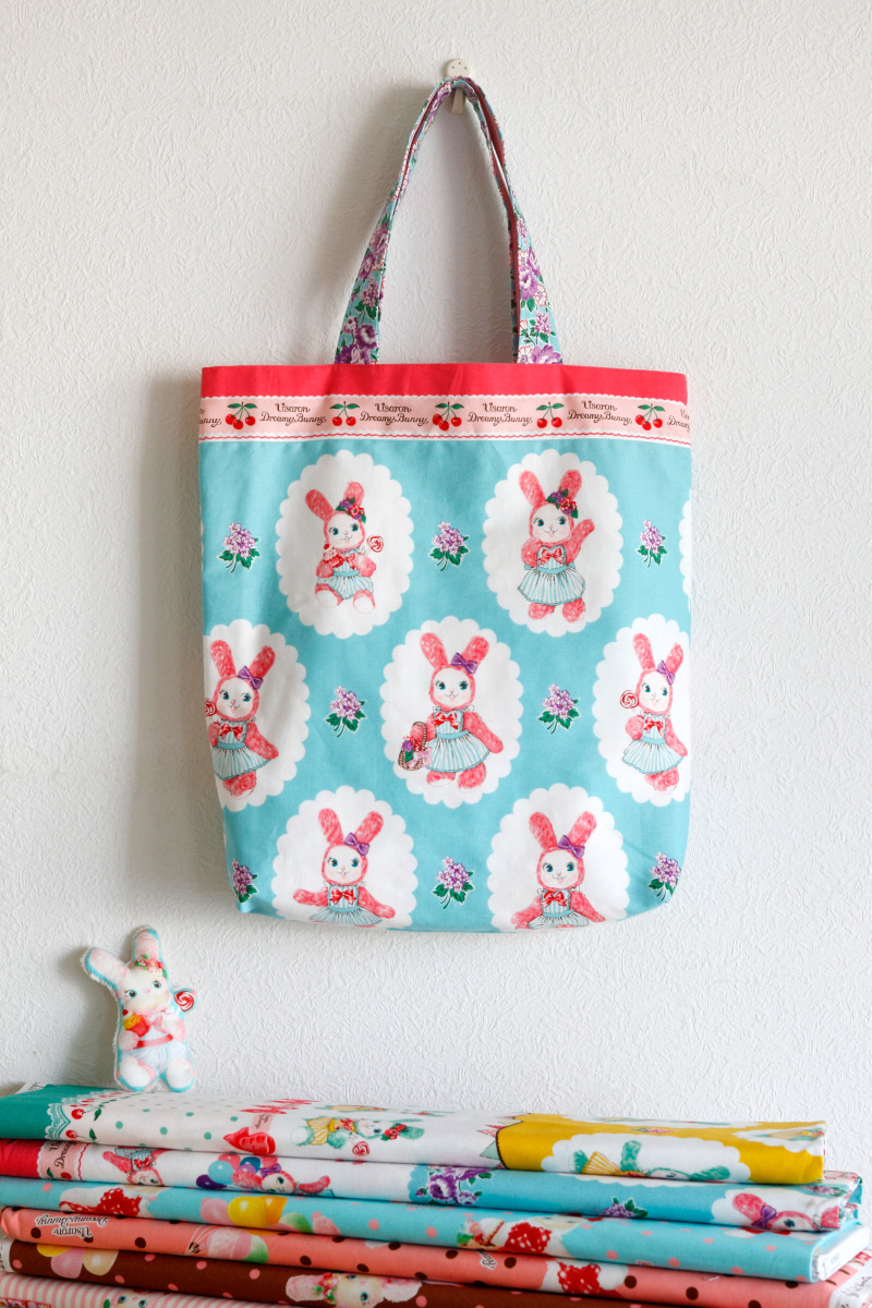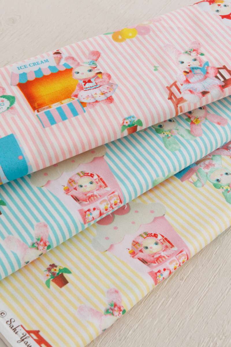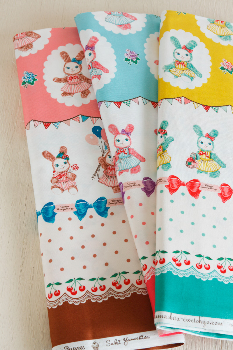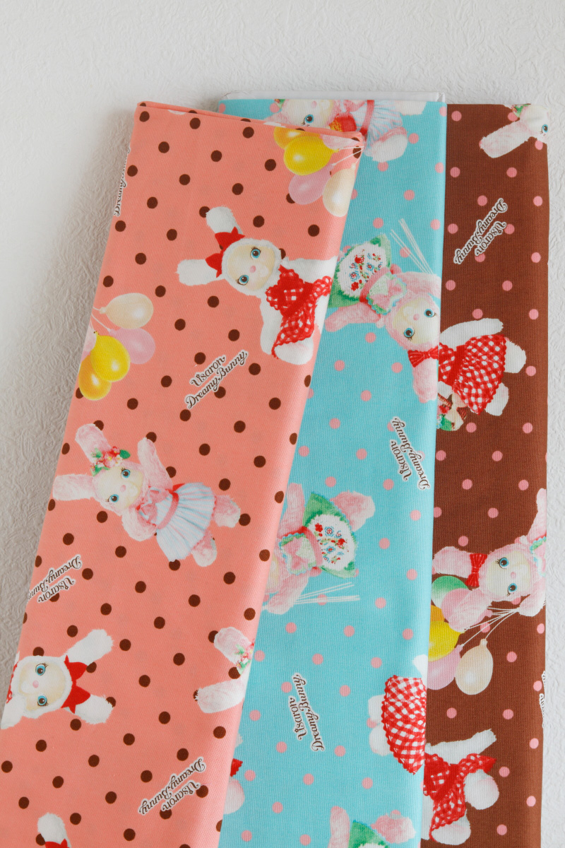 A very lovable bunny fabric is here! It’s called Usaron*. Usaron loves cute things, tasty food and getting dressed up! A bit mischievous and funny, that is Usaron.