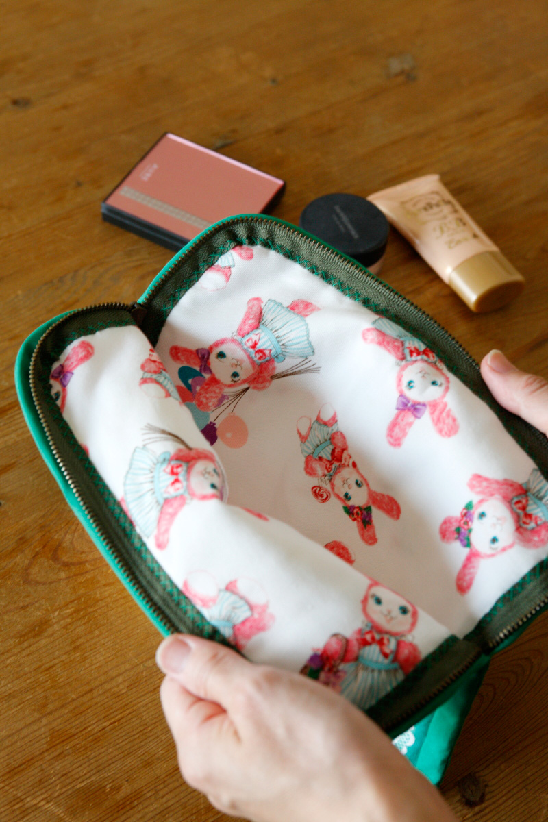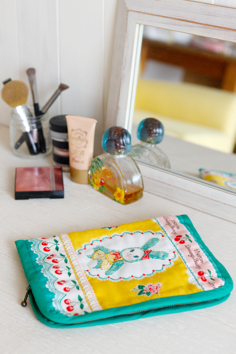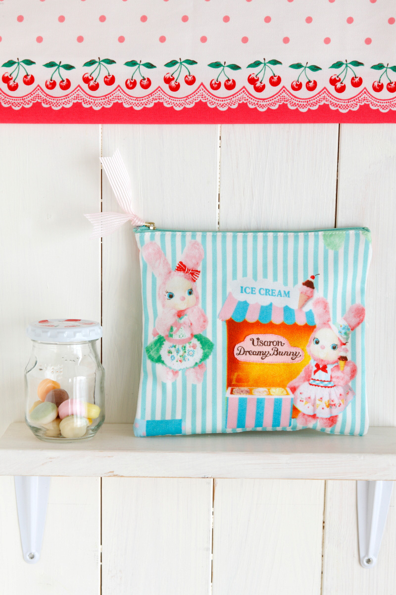 Usaron’s creator, Saki Yamashita says,“Usaron’s movements, poise and motif are expressed all over the fabric. With a slightly thicker Oxford as its material, such everyday personal items as bags and small cases are great. Interior décor goods like curtains and cushion cover are perfect as well. Children’s skirt and parent-and-child matching aprons will be cute to make. If you end up with a remnant, you may cut out the motif for an applique or easily make a stuffed Usaron charm. Placing the right sides of the cutout fabric together, sew around Usaron, turn it over, put the cotton stuffing inside and you will have a cute Usaron charm! With your creative ideas, Usaron will accompany you everywhere!”