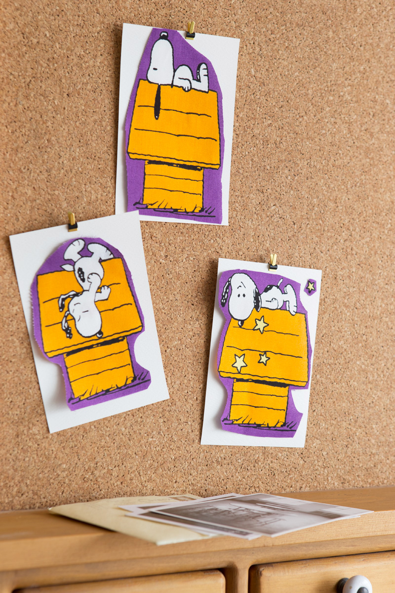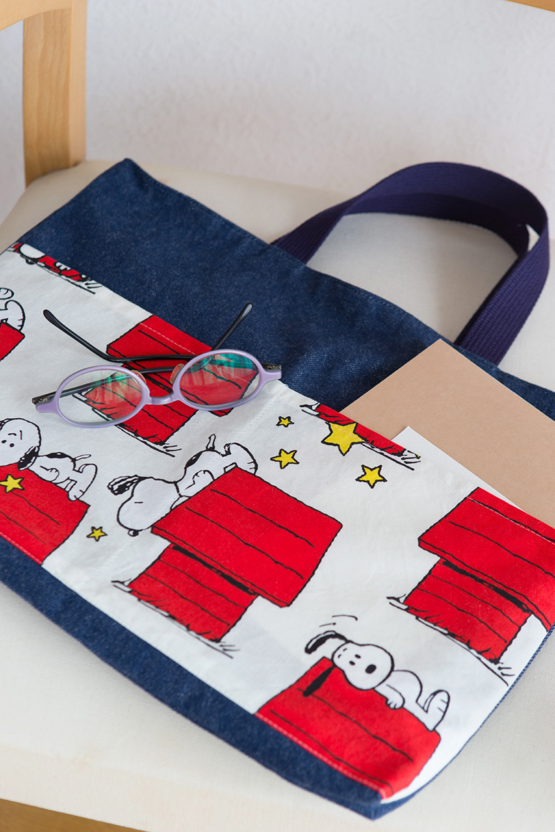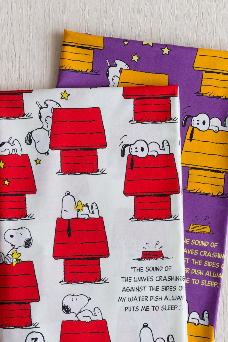 While there are many fabrics featuring Peanuts artwork, a simple yet representative motif was consciously chosen for the design. The purple background adds a more vintage feel, creating a nostalgic atmosphere.