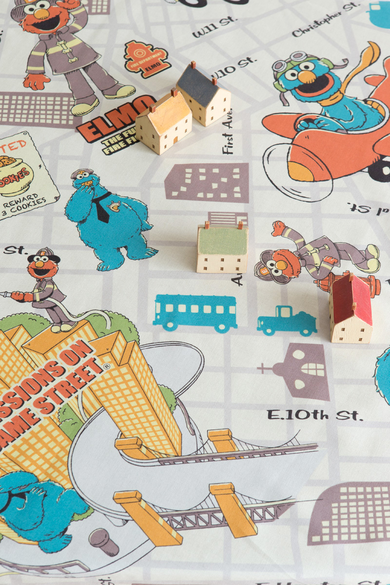 Well known muppets from the TV series are here. To create a fabric with a storyline, a roadmap design depicts a story behind it.