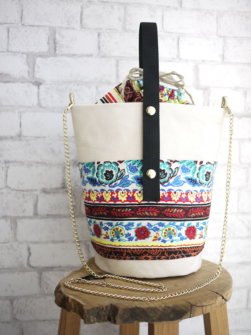 お財布や携帯など外出時の必需品がきちんと入る、小ぶりサイズのバケツ型バッグです。主役の布は、ビビッドな蛍光色が目にまぶしい「african color」シリーズ。本体は厚手の6号帆布でシンプル&本格的に。スナップボタンを留める位置で持ち手の長さを調節できるようにひと工夫。チェーンなどをつないでショルダーバッグとして使うこともできます。