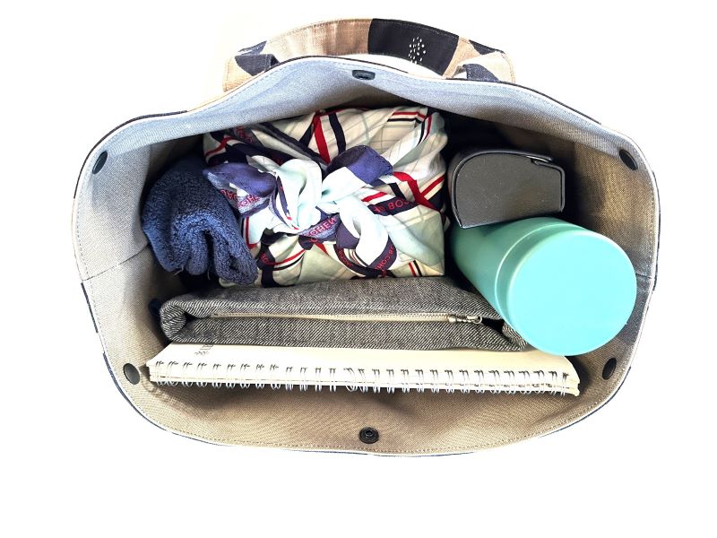 すっきり持ちたい時はサイドのスナップを留めてコンパクトに、外せばたくさん物が入る2wayにしました。水筒、お弁当、ポーチ、ノートなどなどたっぷり便利に入れられます。ポケットも3つあります。