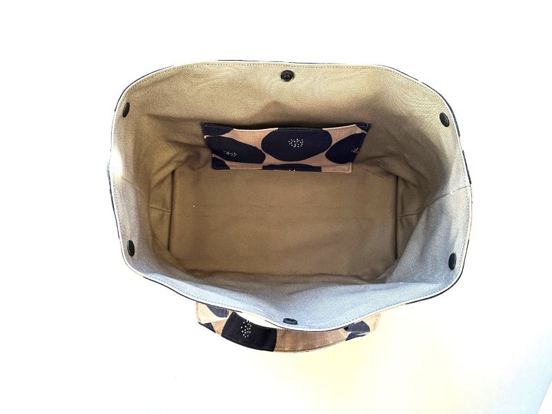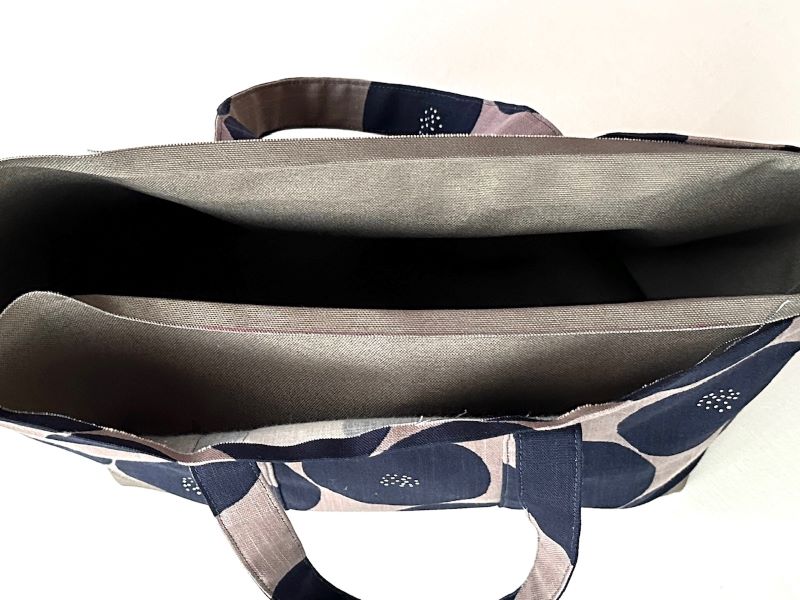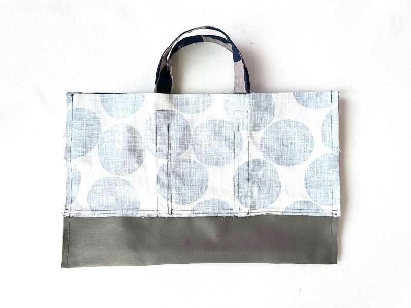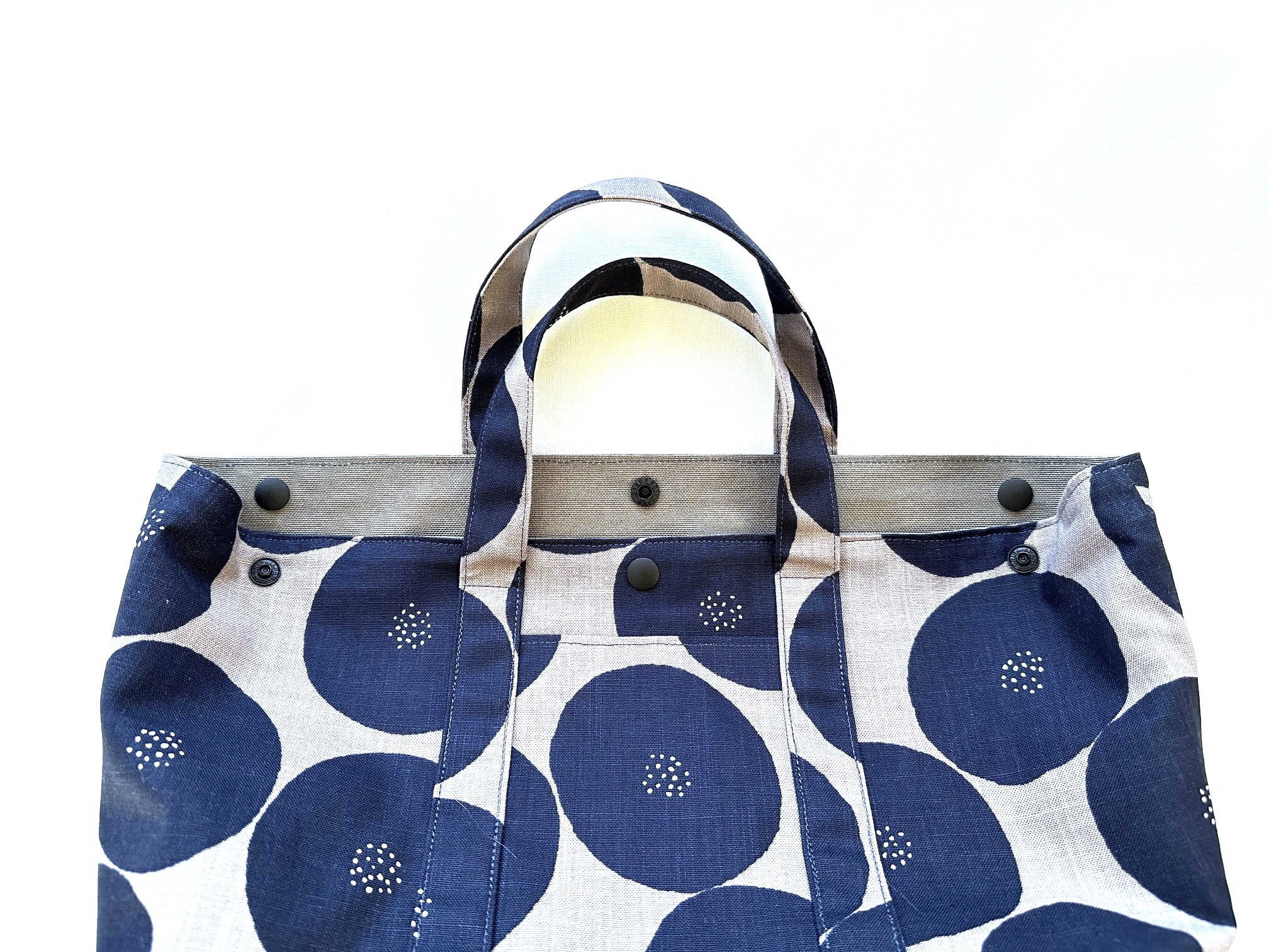 スナップを留めればコンパクトに、外せばたっぷり収納できる2wayトートバッグです。外ポケットと内ポケットつきなので、こまごましたものもすっきり。使った布は、MUDDY WORKSの「あんぱん」シリーズ。グレージュ×ネイビーの綿モーリーに、ほどよい厚みのオリーブブラウンの9.5号帆布を合わせました。