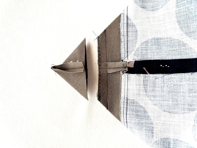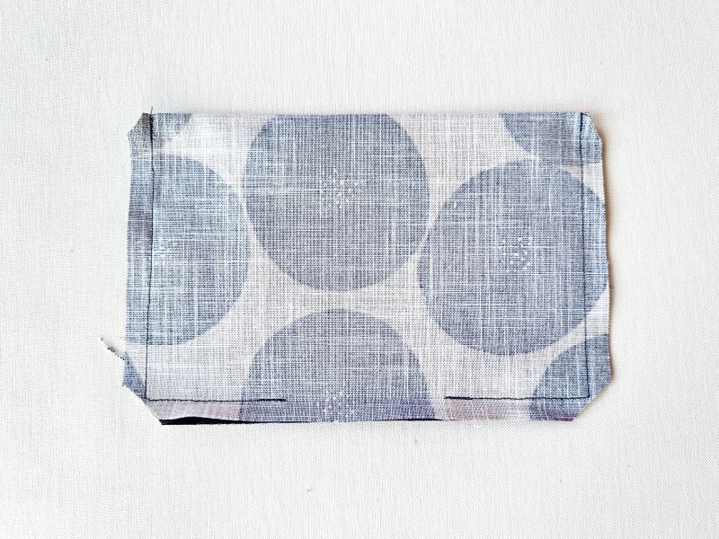 内ポケットを中表に二つ折りし、返し口を残して縫います。縫い代の角を切り落として表に返し、ポケット口にステッチをかけます。