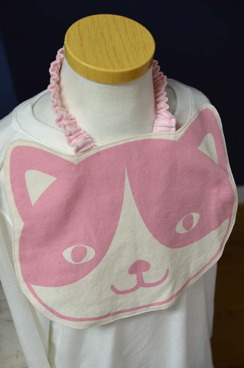 動物の顔を描いた「ANIMAL FACE」シリーズで作ったよだれかけです。好みの顔と同サイズの裏布を裁断し、肩ひもをつけて縫うだけのかんたん仕上げ。1リピートにネコ、パンダ、ブタ、クマ、トリ、イヌの6種類が描かれているので、6枚作れば日替わりで楽しめます。