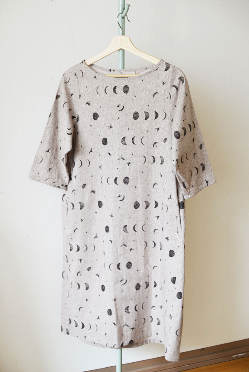 線画タッチのシックなテキスタイル、「Natural life」シリーズで作ったワンピース。後ろにタックを寄せて、正面をすっきりと見せたシンプルなデザインです。デイリーウエアはもちろん、インパクトのある小物と合わせれば、おしゃれなお出かけコーデも楽しめそう。