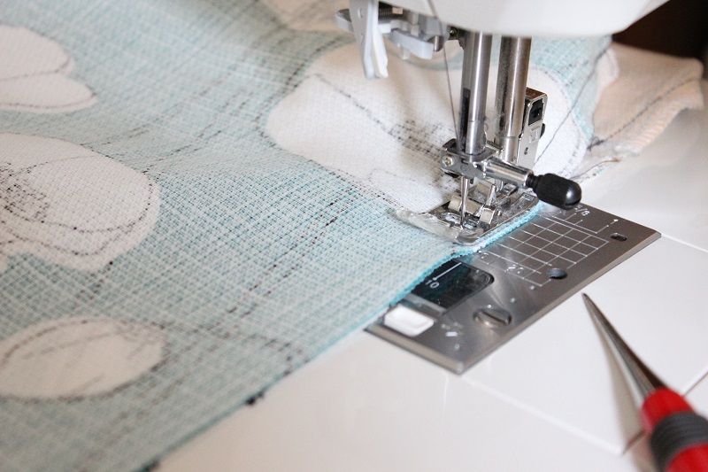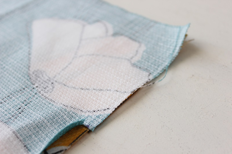 サイズ通りに生地をカット。 口布になる生地は、あらかじめ片側の縫い代を1cmたおしてアイロンをかけ、折り目を付けておく。