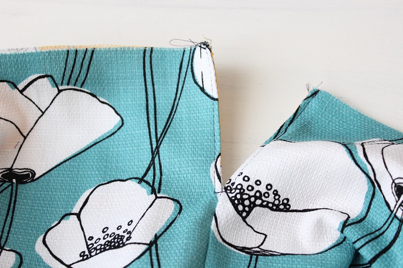 同じ生地同士を表合わせにして、縫いどまりから袋の底に向けて縫う。
