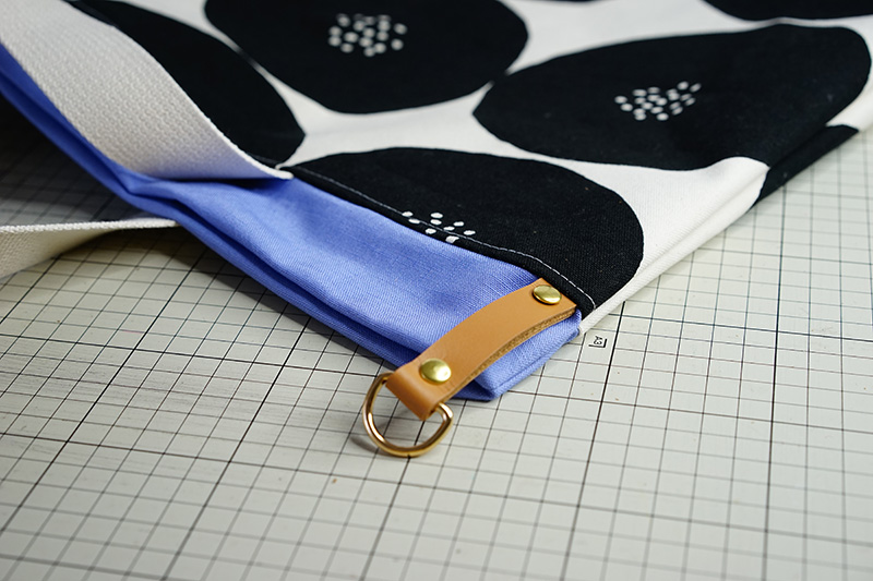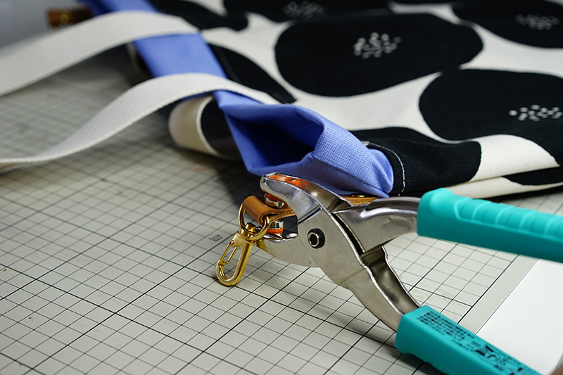 合皮テープにDカンを通し半分に折り、カシメで2ヵ所とめます。