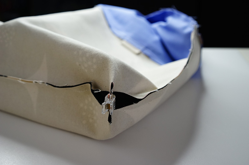 両端、底を中表に縫い合わせ、マチをたたんで縫います(表裏布合計4ヵ所同様に)。※裏布には返し口をあけておきます。