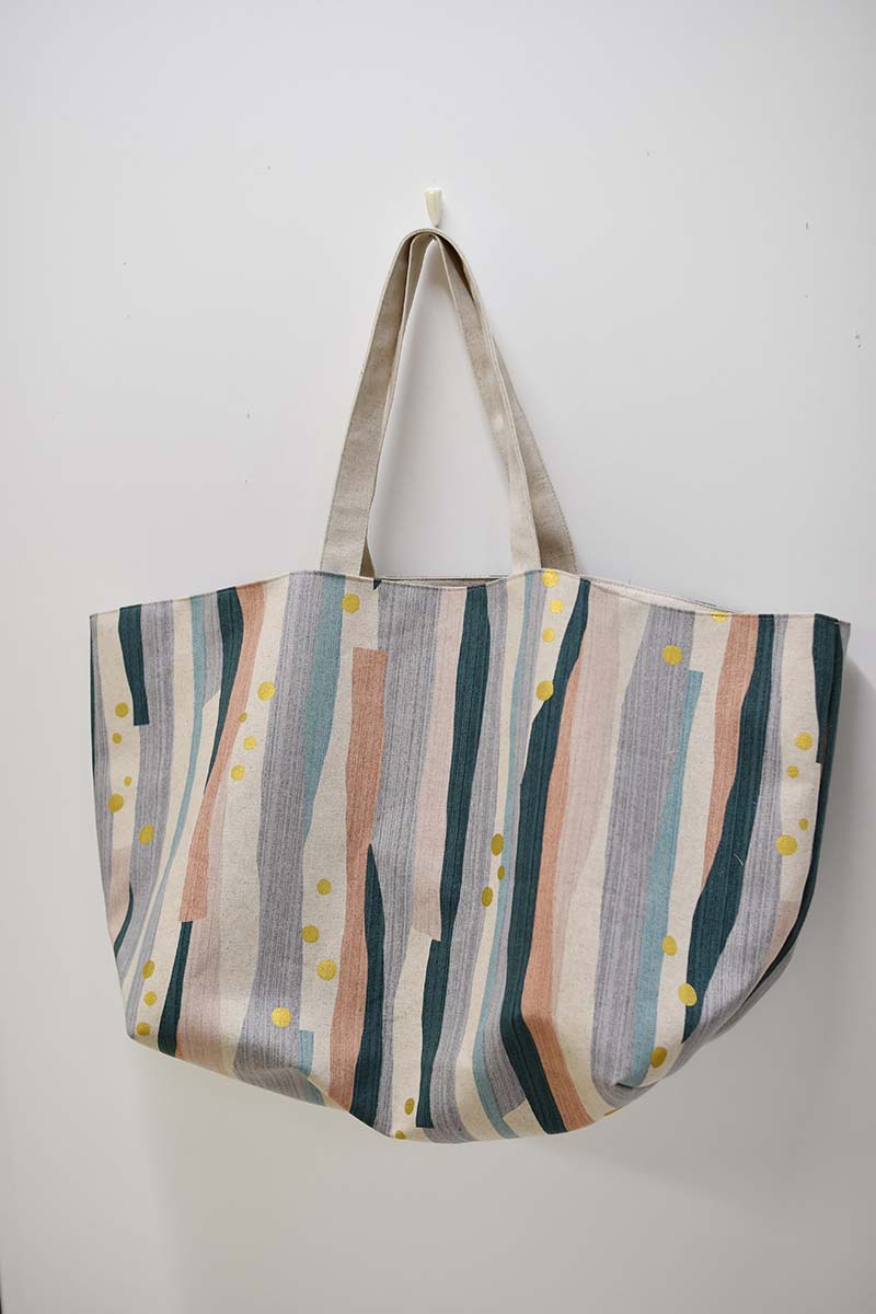 年末年始のショッピングに便利な大きなトートバッグです。マチもたっぷりあるので、マザーズバッグにも。使った布は「CANVAS」シリーズ。シンプルで大人っぽいプリントは、普段づかいにもしっくりなじみます。バッグづくりにぴったりの厚手の綿麻キャンバスです。