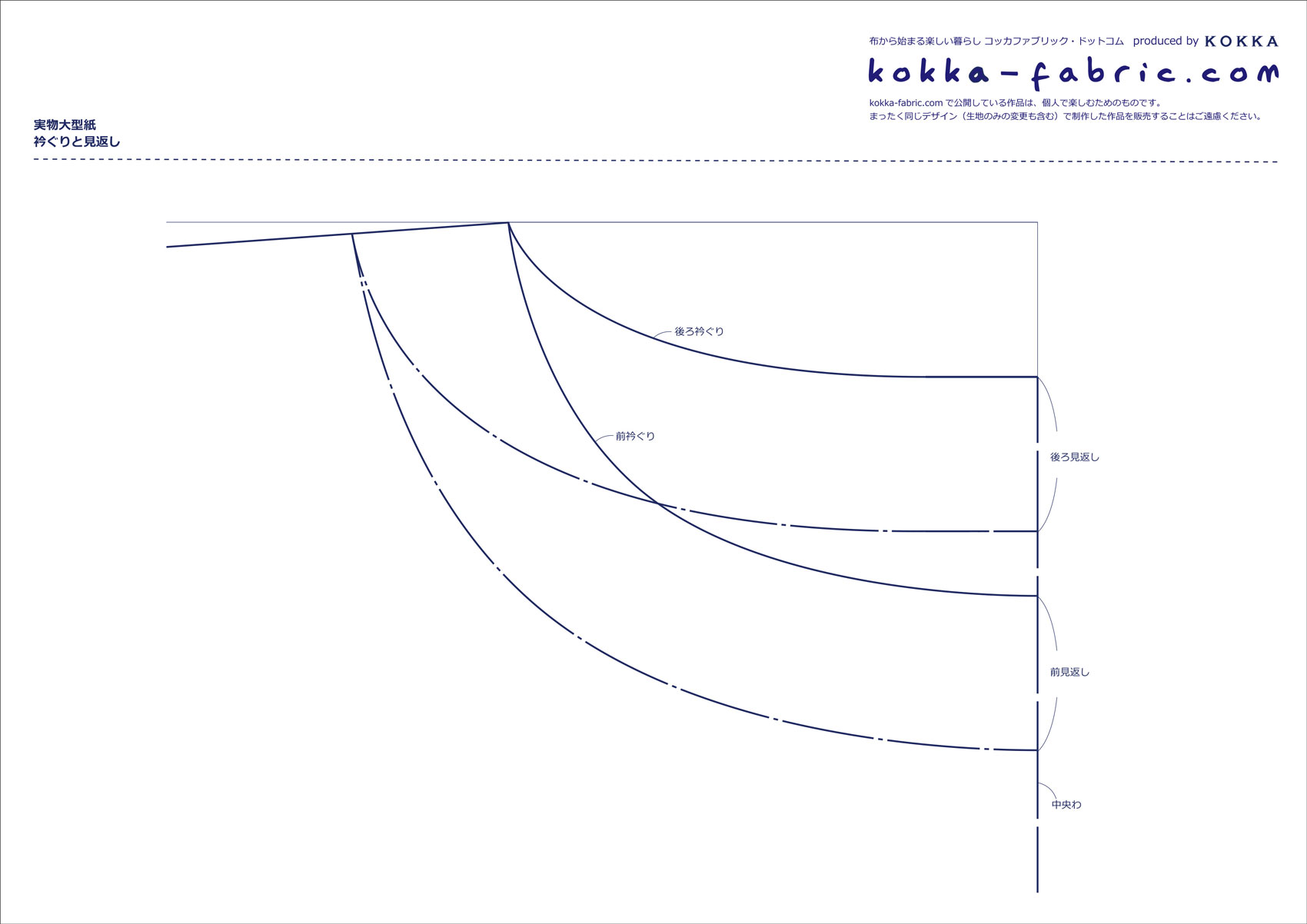 作り方レシピの「製図」を参考にして、プリントアウトした衿ぐりの型紙を当てて、前衿ぐり、後ろ衿ぐりをそれぞれ写してください。