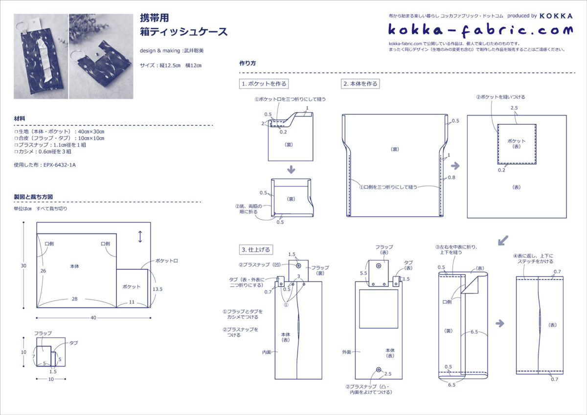 フラップやタブは最後にカシメでつける作り方なので、縫う作業はとてもシンプルです。共布でフラップやタブを作って挟み込んでもかわいいと思います。ティッシュを出し入れする口部分を1cmほど重ねて縫うと、ティッシュを引き出すときのストッパー的な役割をしてくれます。