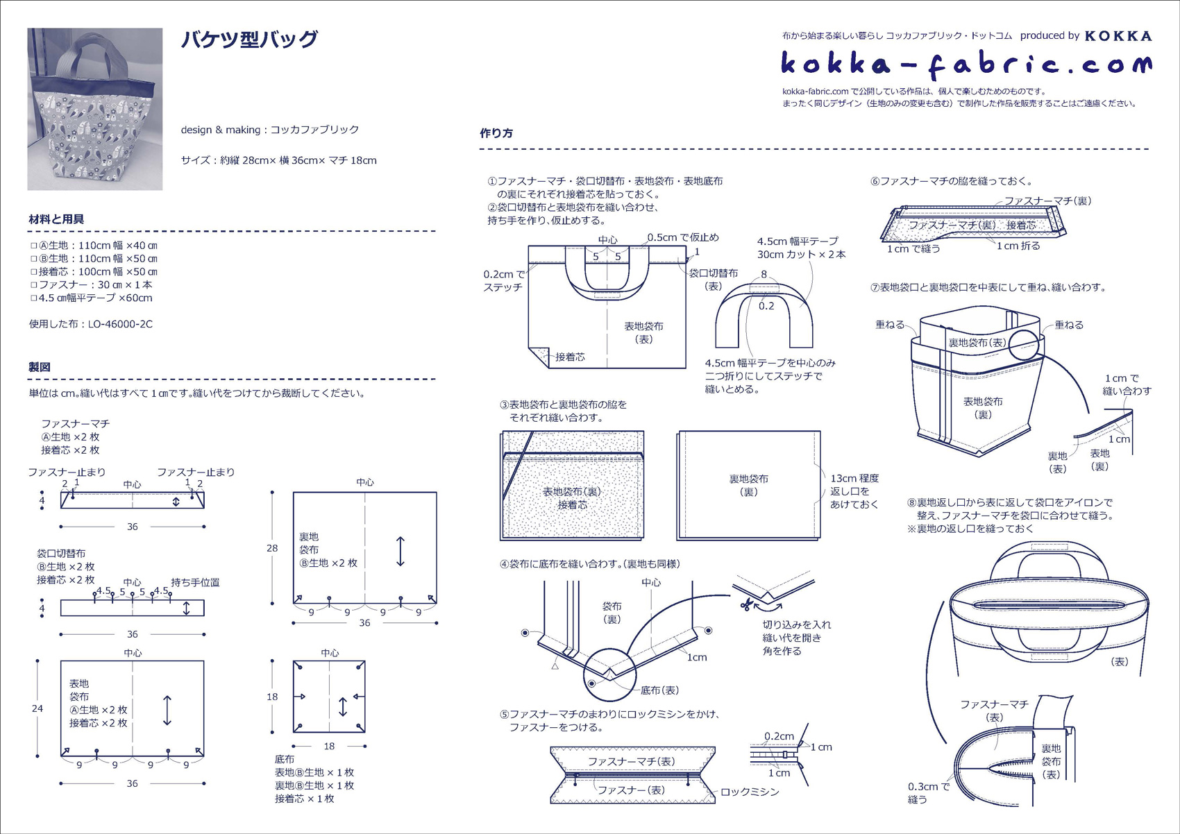 ファスナーつきのバケツ型バッグは、ちょっとそこまでのお出かけに便利なアイテム。楽しげな小鳥さんが並んだプリントは「Powerful Glitter」シリーズです。袋口切替布や持ち手のテープの色を変えると印象がまた変わりますよ。