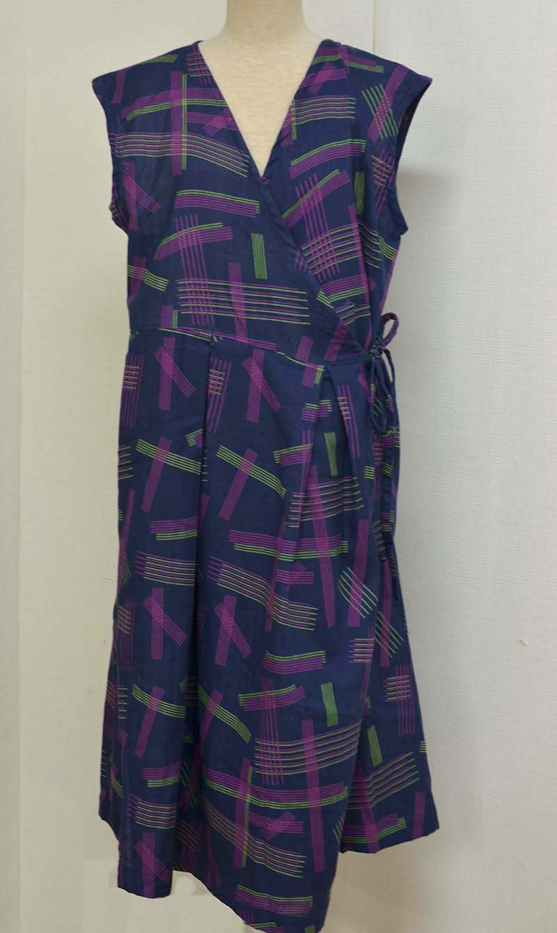 エレン・ベイカーさんの新柄、parallelsのダブルガーゼで作ったカシュクールワンピースです。交差点を幾何学モチーフに落とし込み、渋めの地色に配した柄は、個性的すぎず、1枚布のワンピースに仕立てても上品な雰囲気に仕上がります。