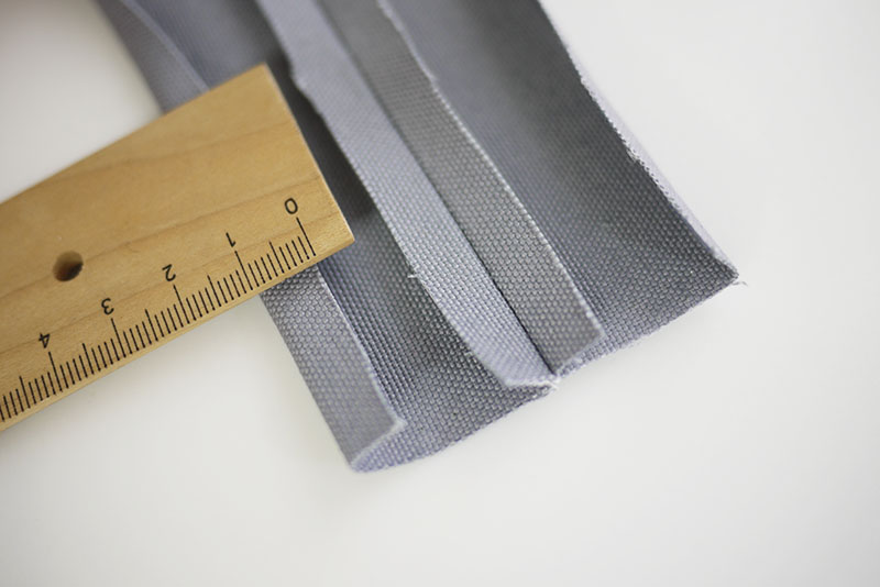 持ち手を作ります。2枚を中表に合わせ、長辺片側を1cmの幅で縫います。