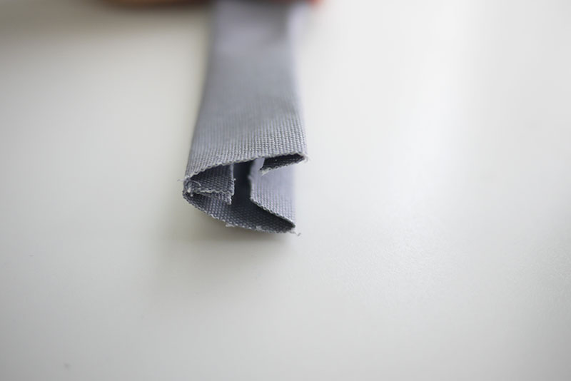 外表で半分に折り、長辺両端から約2mmのところをステッチします。このとき、でき上がりのステッチが二重にならないように本体に縫いつける部分(各先端から20cm)は縫い残しておきます。※同様に2本作ります。