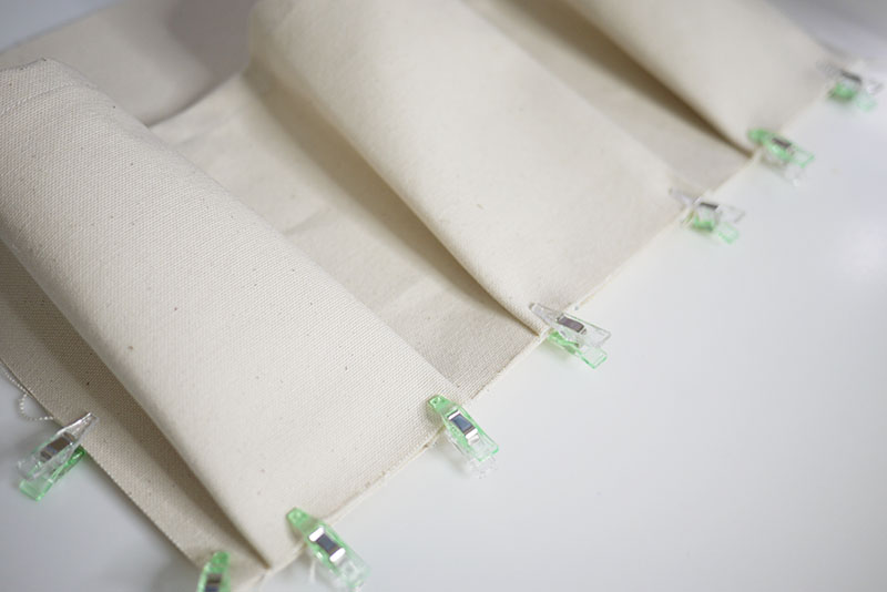 ポケット口を三つ折りし、ステッチします。本体とポケットに合印をつけます。