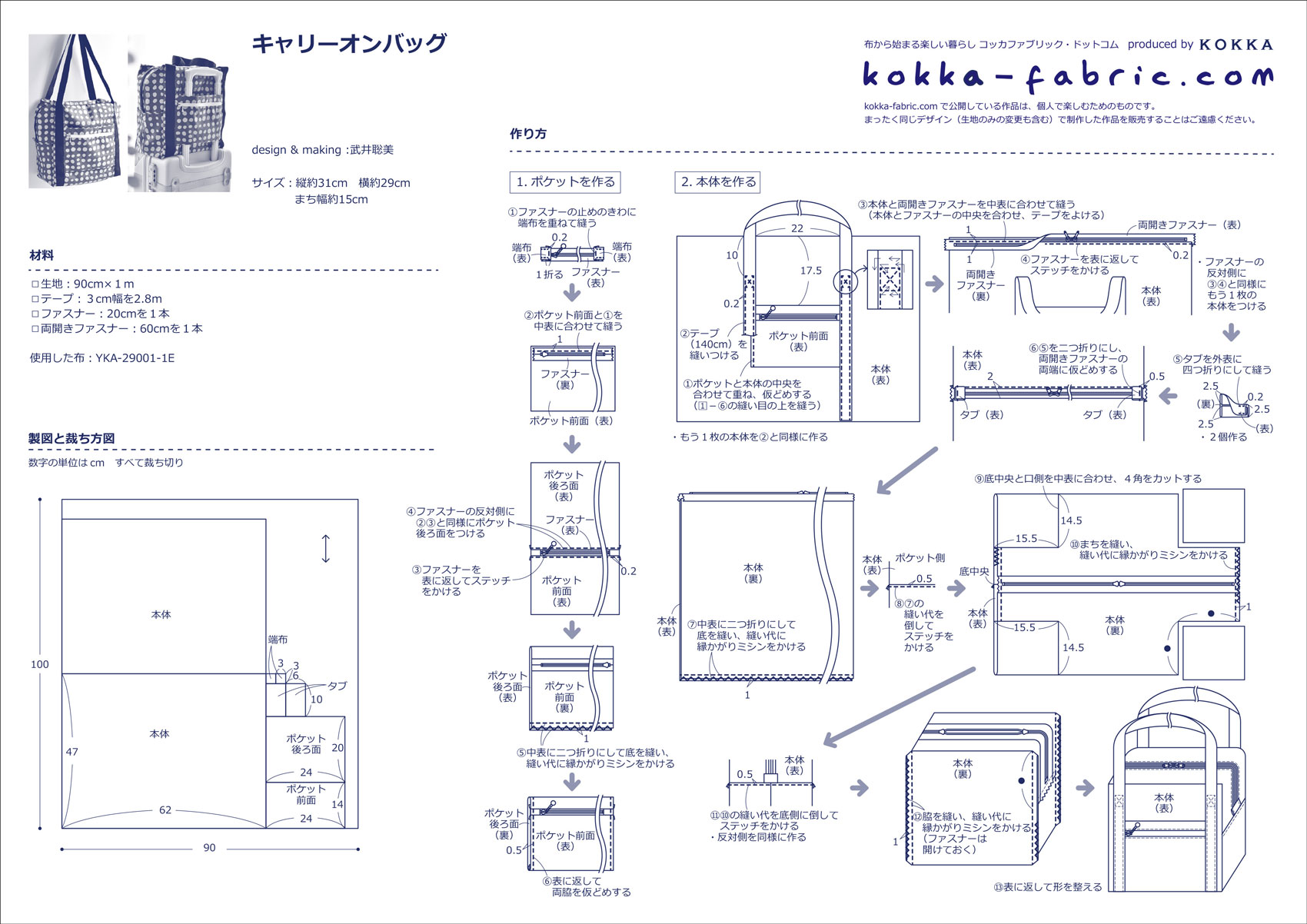 KF:武井さん、どうもありがとうございました!キャリーオンバッグの作り方プロセスも武井さんに撮影していただきましたので、ぜひ、作り方シート(PDF)と合わせて参考にしてくださいね。