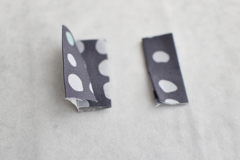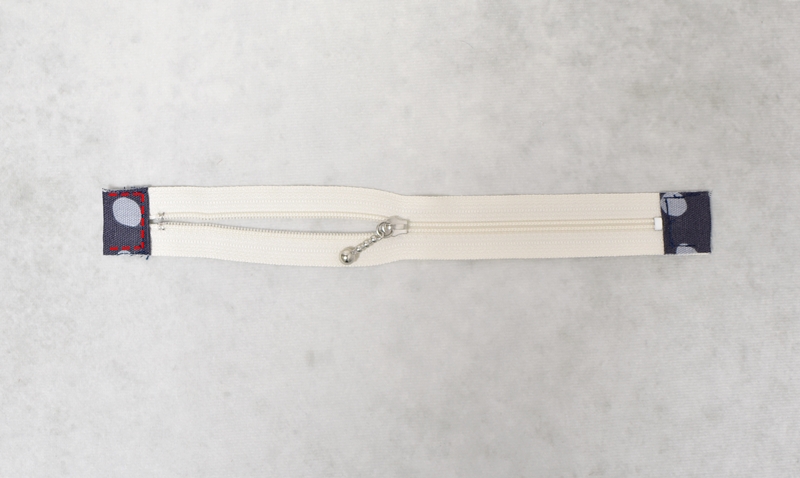 ファスナーの左右につけるタブを四つ折りにして左右の端にステッチを入れ、ファスナーの左右に縫いつけます。