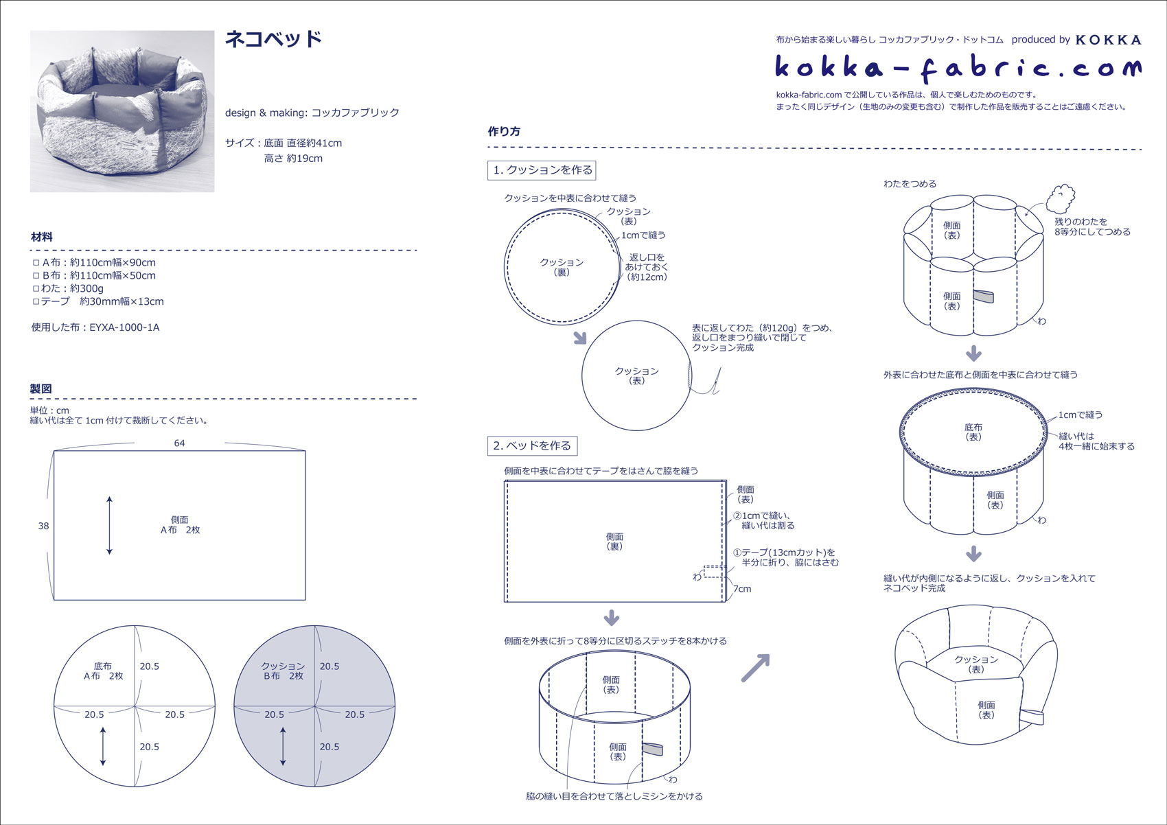 丸くなって寝ることが多い猫ちゃんにぴったりな丸型のベッドです。使った布は「NekoNoe」シリーズ。テキスタイルデザイナーの吉本悠美さんがデザインしたアーティスティックな猫柄は、お部屋のインテリアにもフィットします。コットン100%のシーチングは縫いやすく、ソーイングビギナーにもおすすめです。
