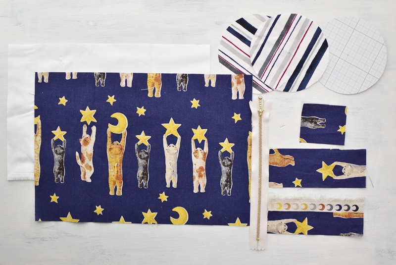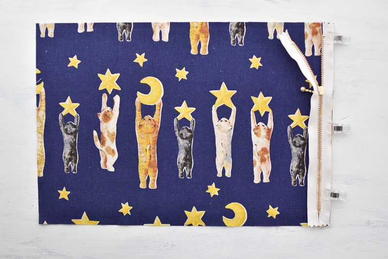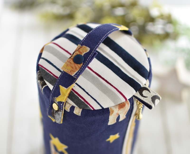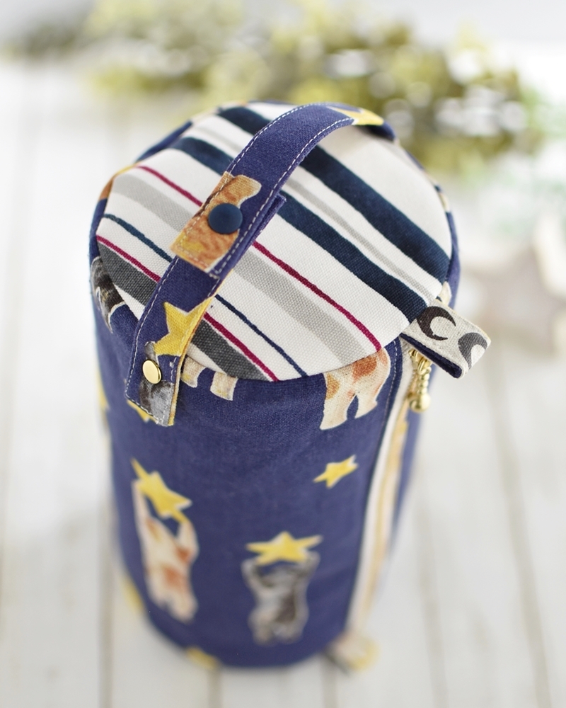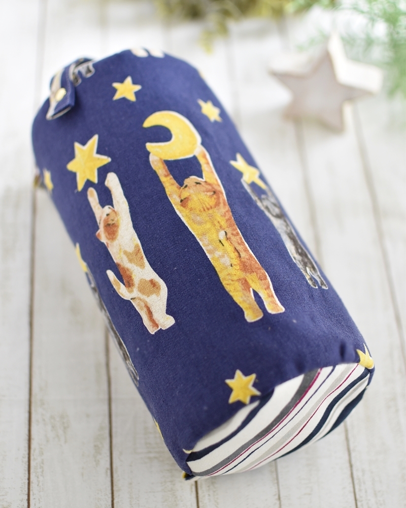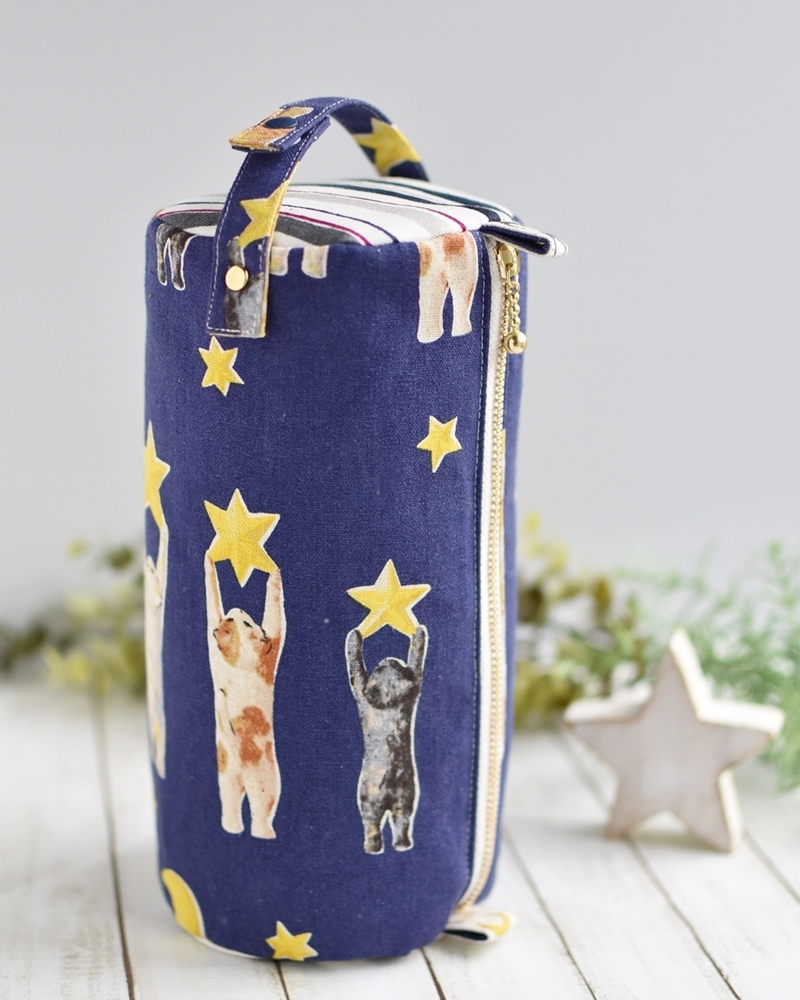 持ち手つきの筒型ポーチです。メイクグッズやソーイング用品を入れるポーチやペンケースとして使えます。こちらの布は、彫刻家の花房さくらさんがデザインした「ネコノテキスタイル」の「夜まで待てない」シリーズ。星や月に手を伸ばしたネコたちのポーズがなんとも愛らしい。綿麻キャンバスなのでバッグやポーチづくりにおすすめです。