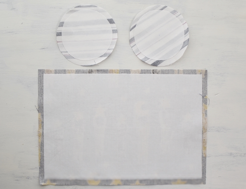 接着芯を本体生地と横マチの丸生地すべて1cm内側になるように置き、アイロンで貼り付けます。