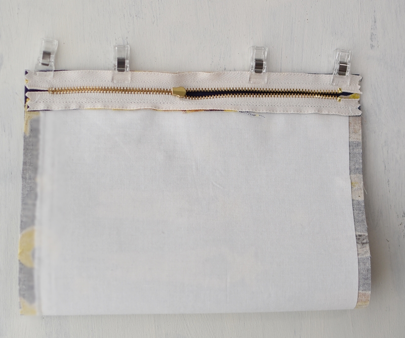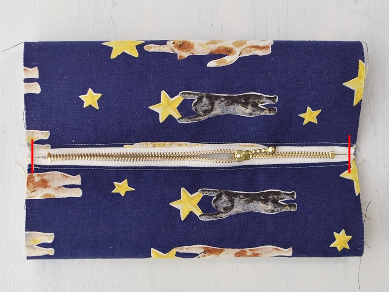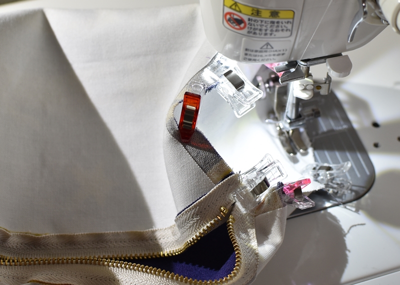 ファスナーの端(画像の赤線部分)を縫い、仮止めします。