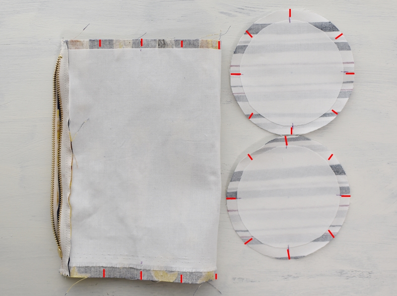 本体と横マチの丸生地の合印に切込み(画像の赤線)を入れます。