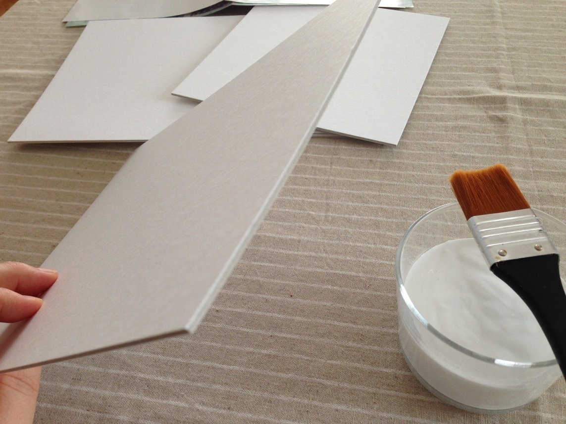 1底用の厚紙Aの短辺の切り口にボンドを塗り、、厚紙Bを貼り付ける。向かい側の面も同様に貼り付ける。