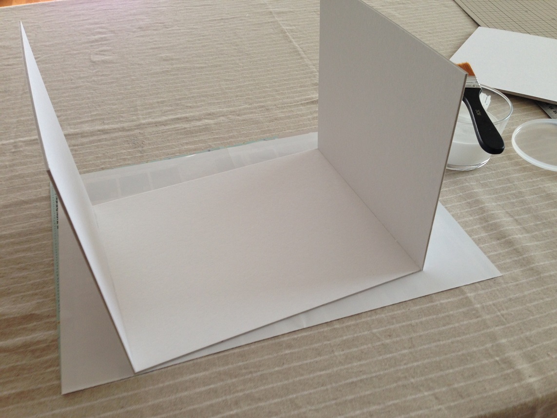1ケント紙A’の1枚にボンドを塗り、生地A”に貼り付け、生地の角を切り落とす。箱の底と側面の下部にボンドを塗り、底面を落とし込むように貼り付ける。底面の空気を抜き、角はヘラを使い、のりしろを側面に立てて貼り付ける。
