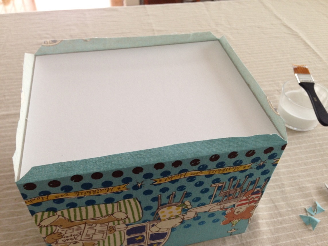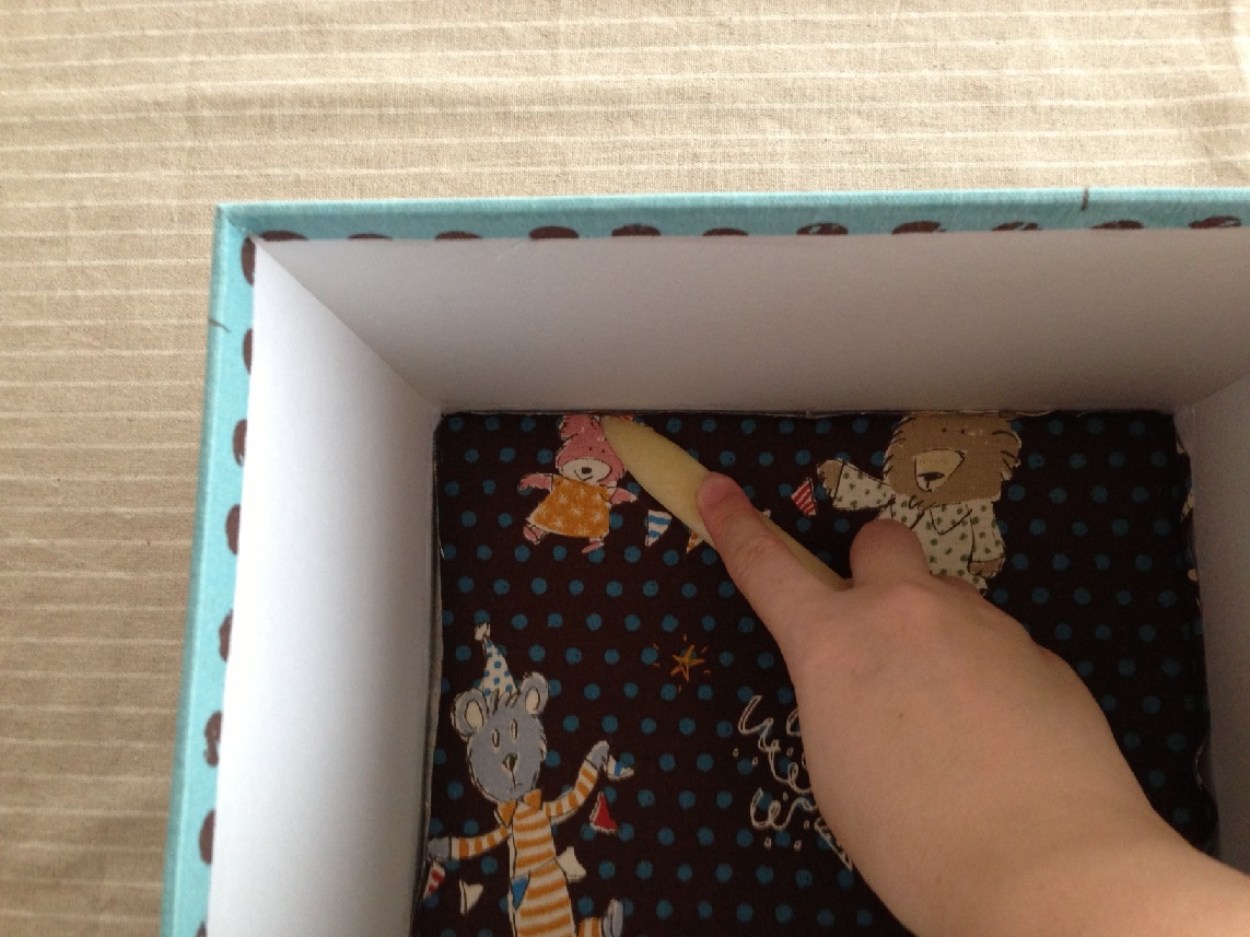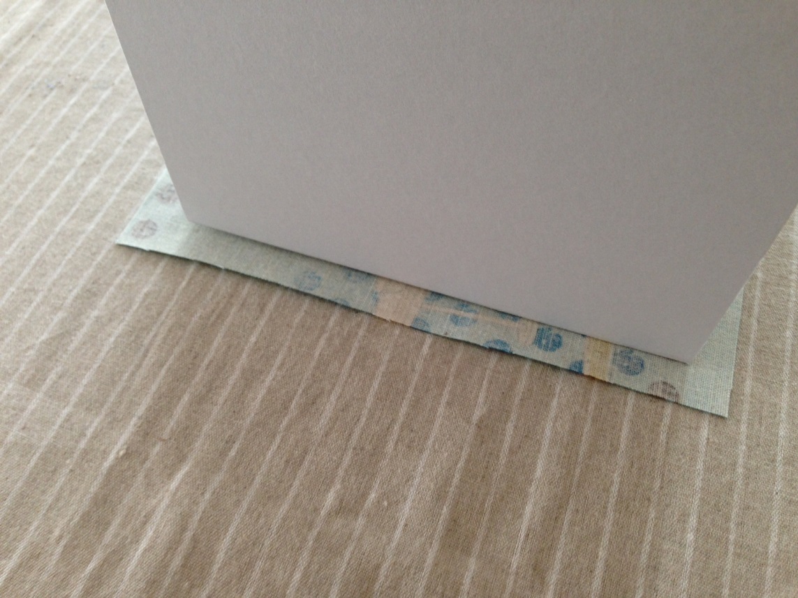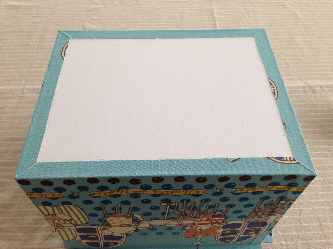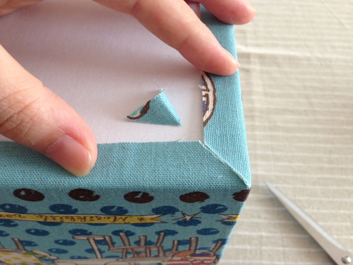 1残りのケント紙A’にボンドを塗り、生地A”に貼り付け、生地の角を切り落とす。全てののりしろを、裏面に折り、貼り付ける。それを箱の外側底面に貼り付ける。