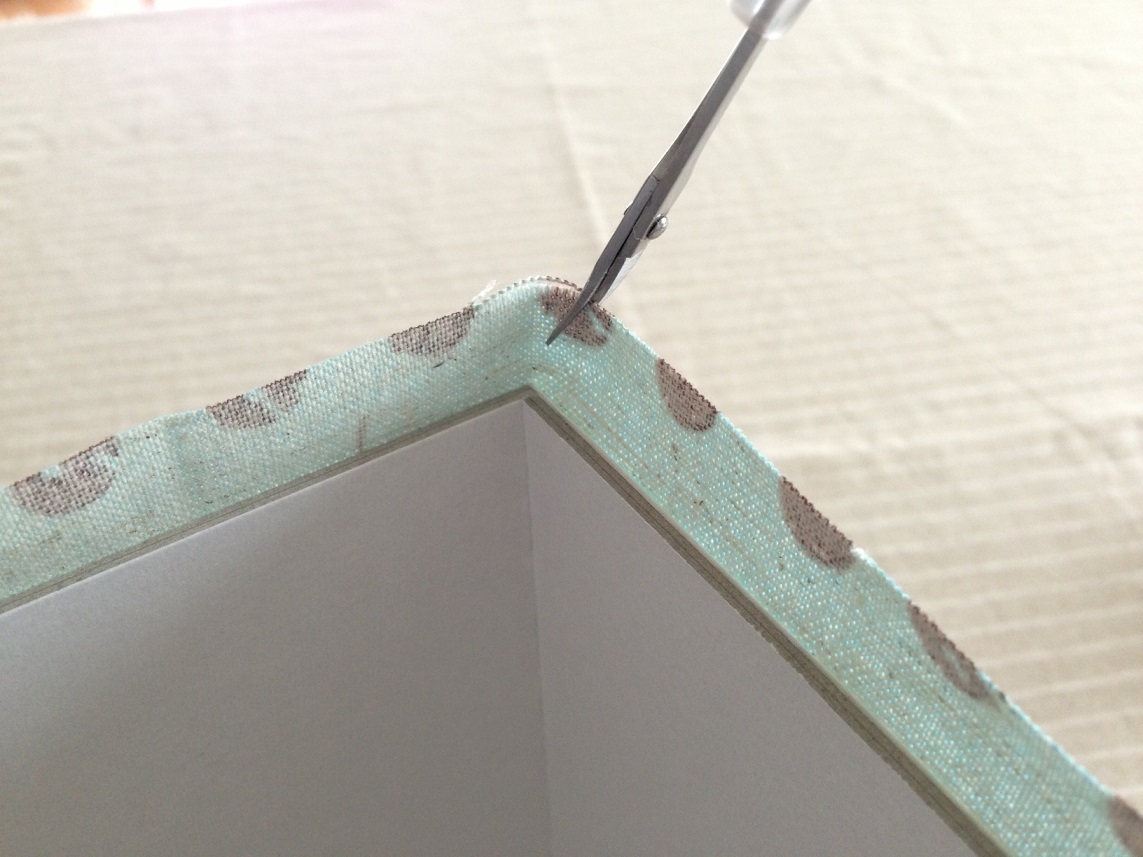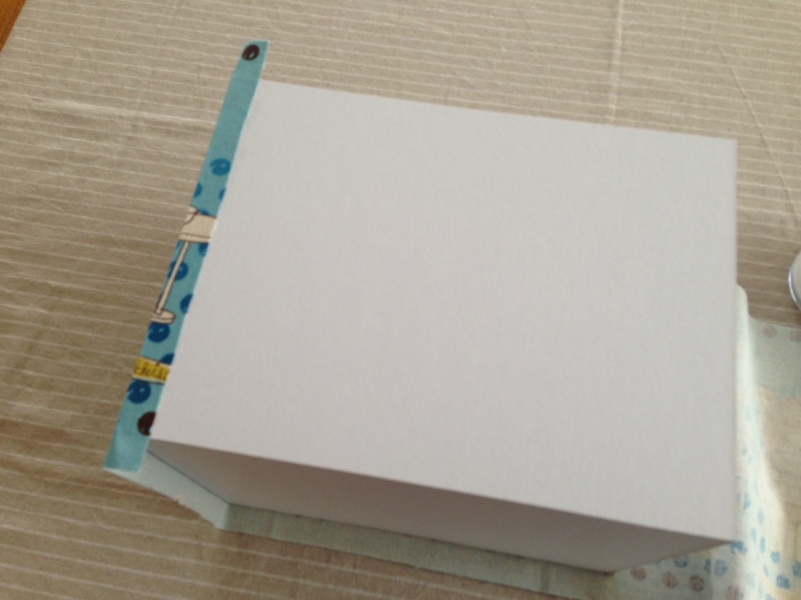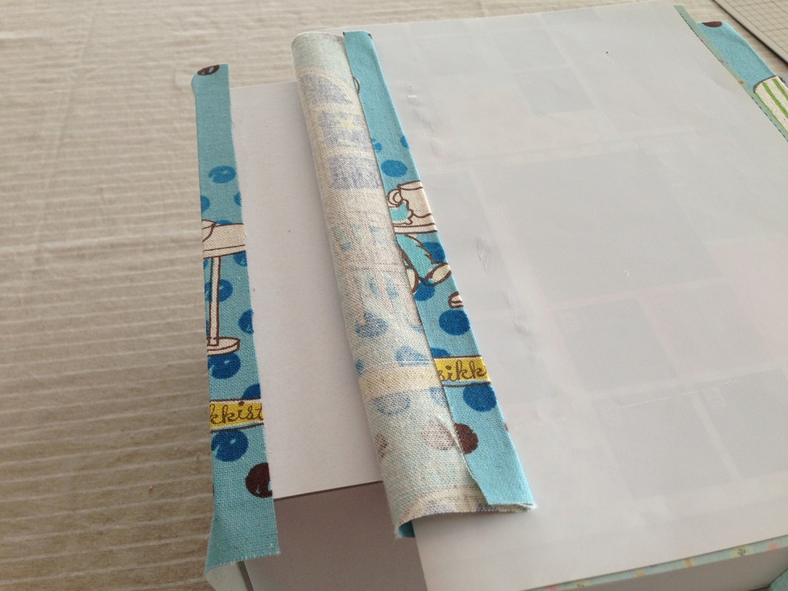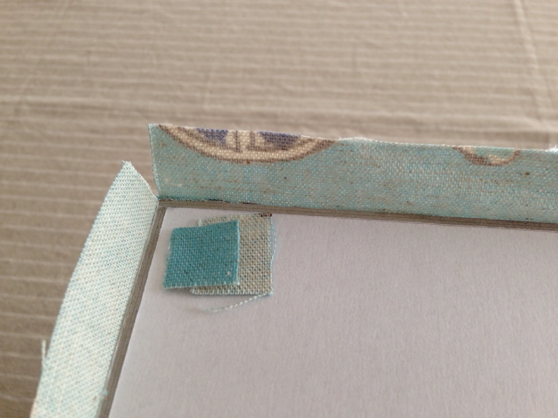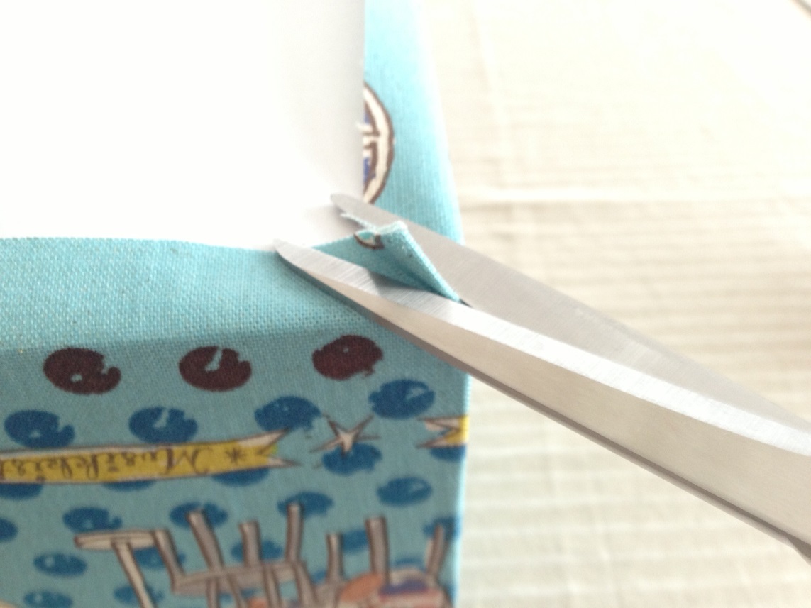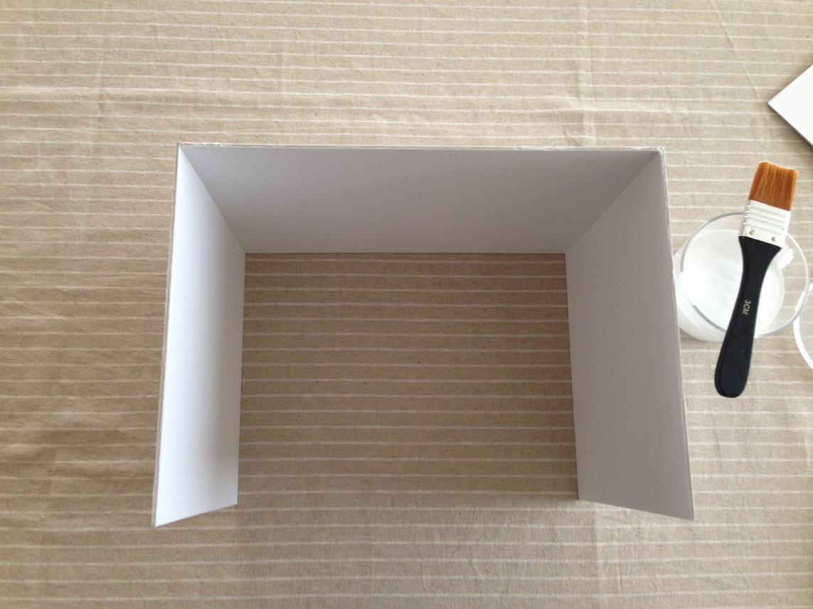 1残りのケント紙A’にボンドを塗り、生地A”に貼り付け、生地の角を切り落とす。全てののりしろを、裏面に折り、貼り付ける。それを箱の外側底面に貼り付ける。