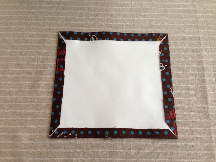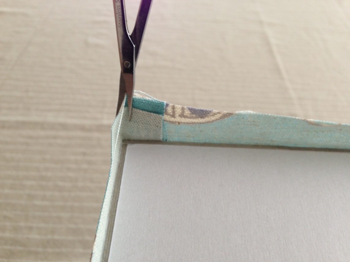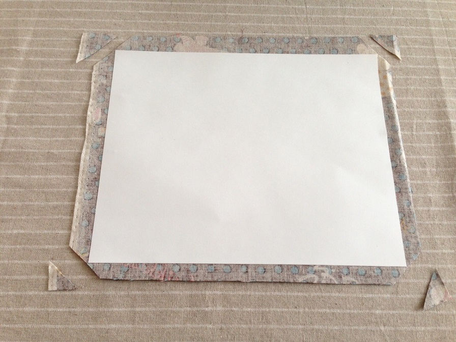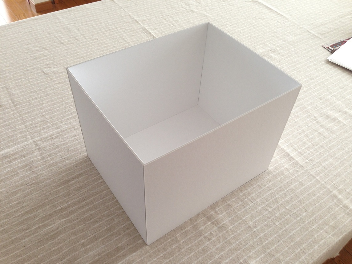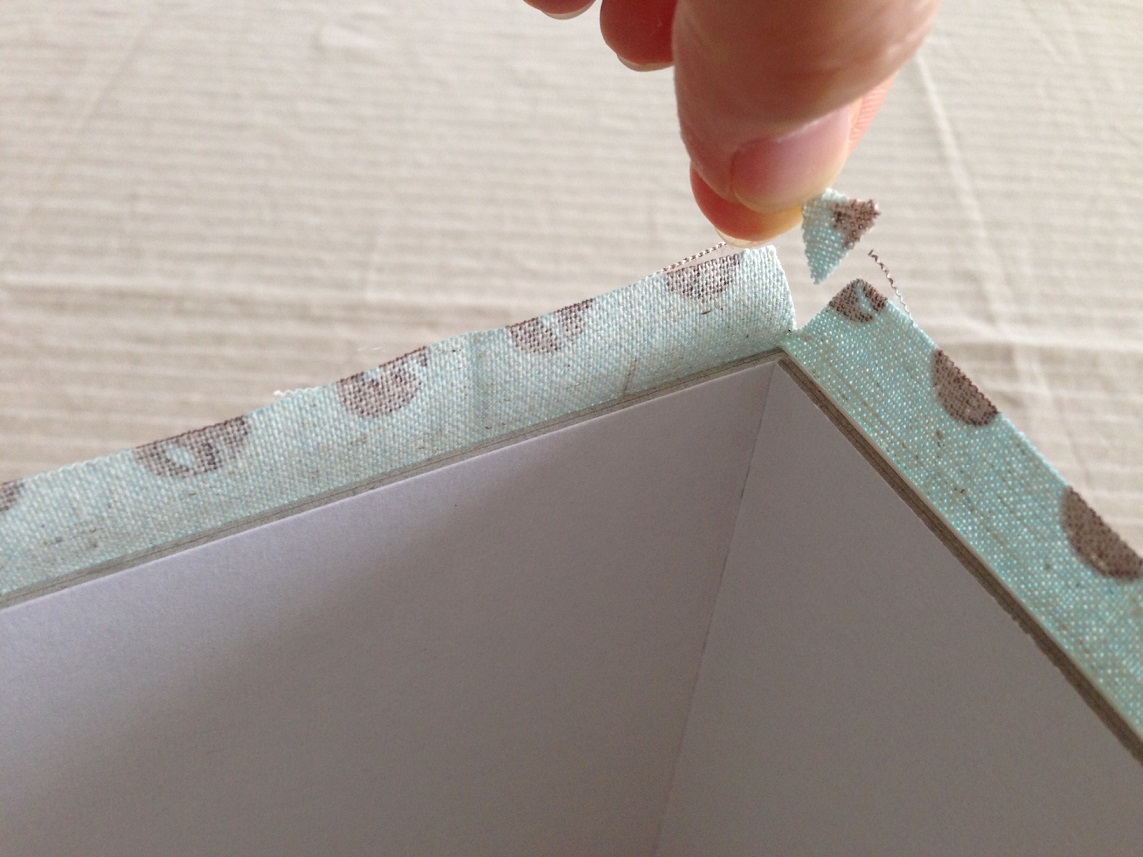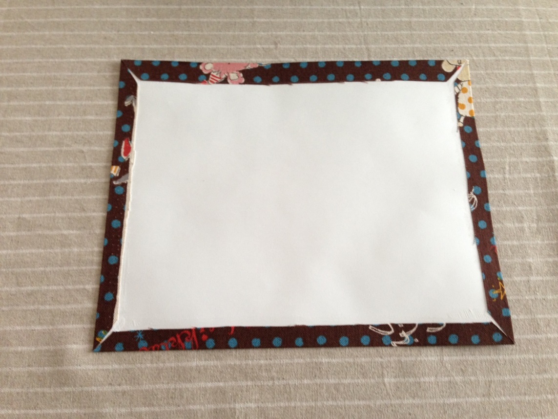 1残りのケント紙A’にボンドを塗り、生地A”に貼り付け、生地の角を切り落とす。全てののりしろを、裏面に折り、貼り付ける。それを箱の外側底面に貼り付ける。