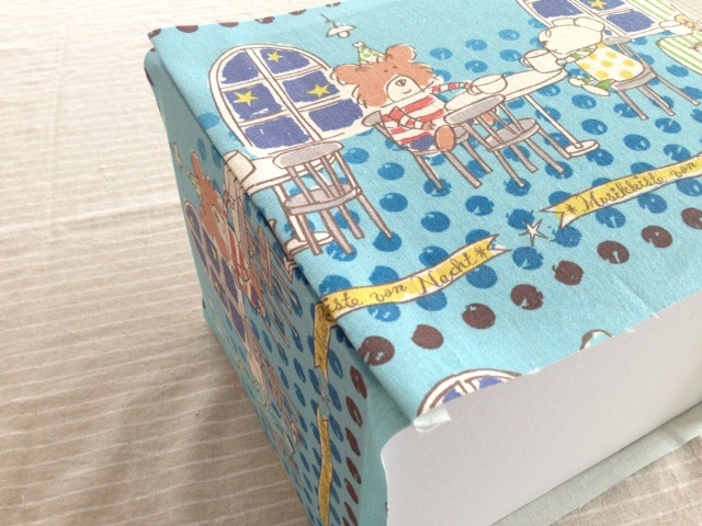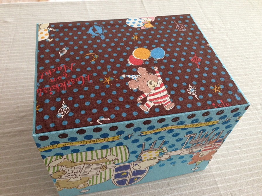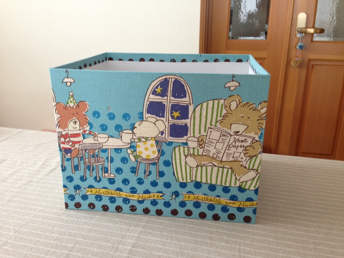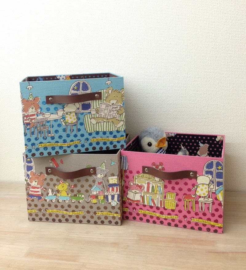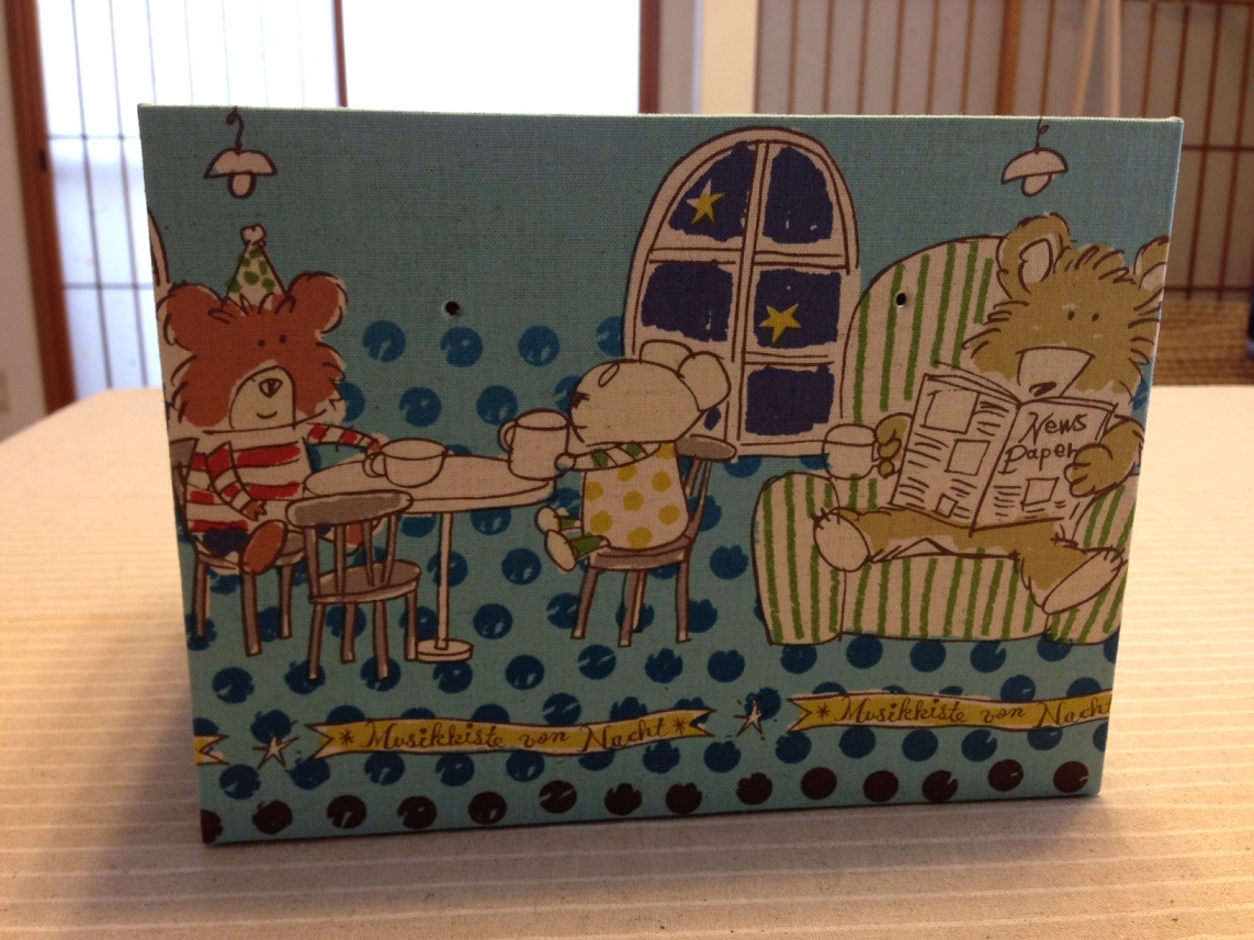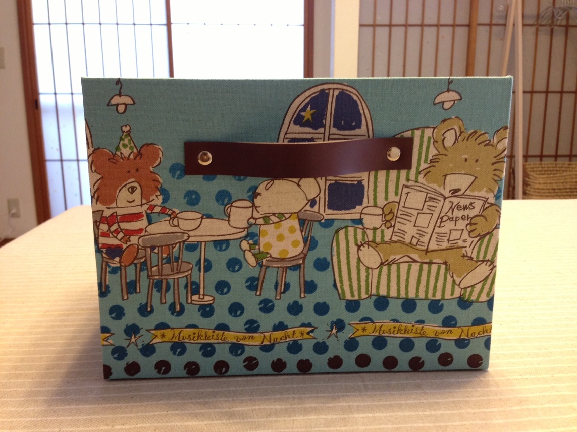 手作り作家さん第2弾は、カルトナージュで実用的でかわいい布箱を作っている、杉山みほこさんの作品です。杉山さんのブログ、「happiness box」には、アイデアいっぱいの素敵な作品が満載です。今回は、キュートなベア柄「Musikkiste von nacht(ムジキスト・フォン・ナハト・夜のオルゴール」を使った、引き出し型の取っ手付きボックスを作ってもらいましたよ!