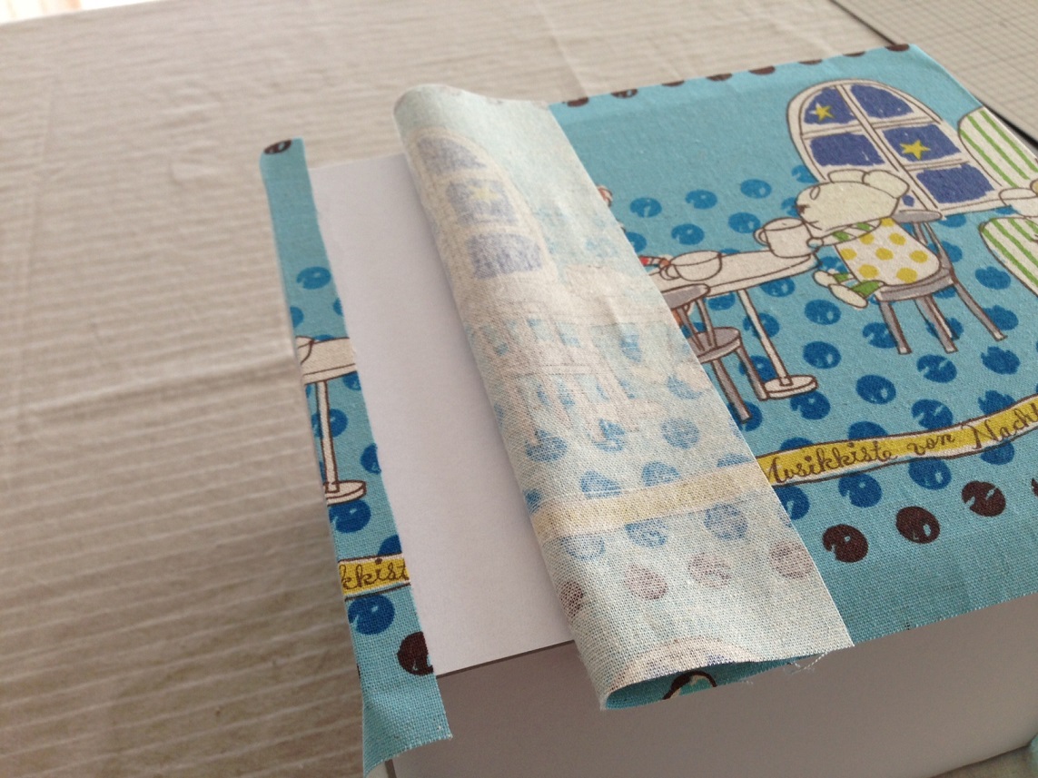 1 箱の側面に生地Dを貼る。まずは、短側面から。片側の短側面一面にボンドを塗る。生地の端15mmを残し、上下にのりしろ15mmを残した位置に貼り付ける。 残した生地の端15㎜は隣の面に貼り付ける。生地1枚で外側面を1周するように、長側面、短側面と一面ずつボンドを塗り、生地を貼っていく。