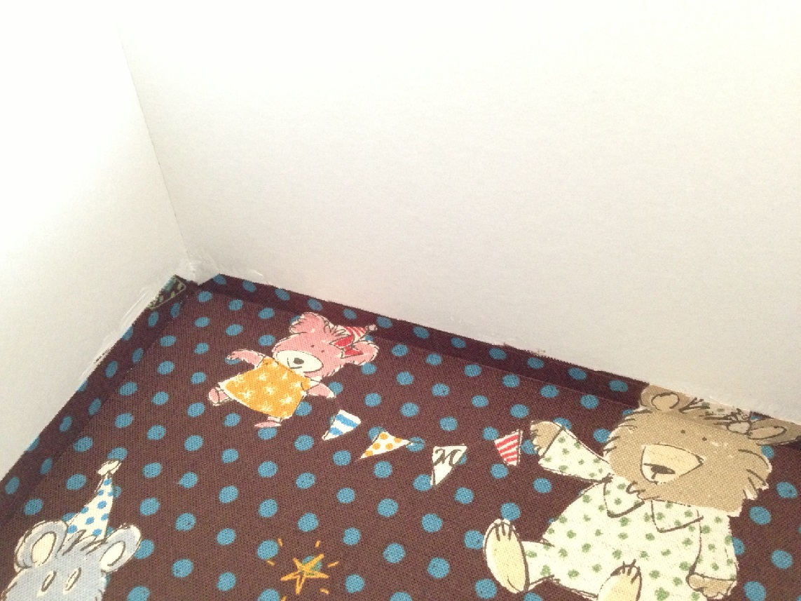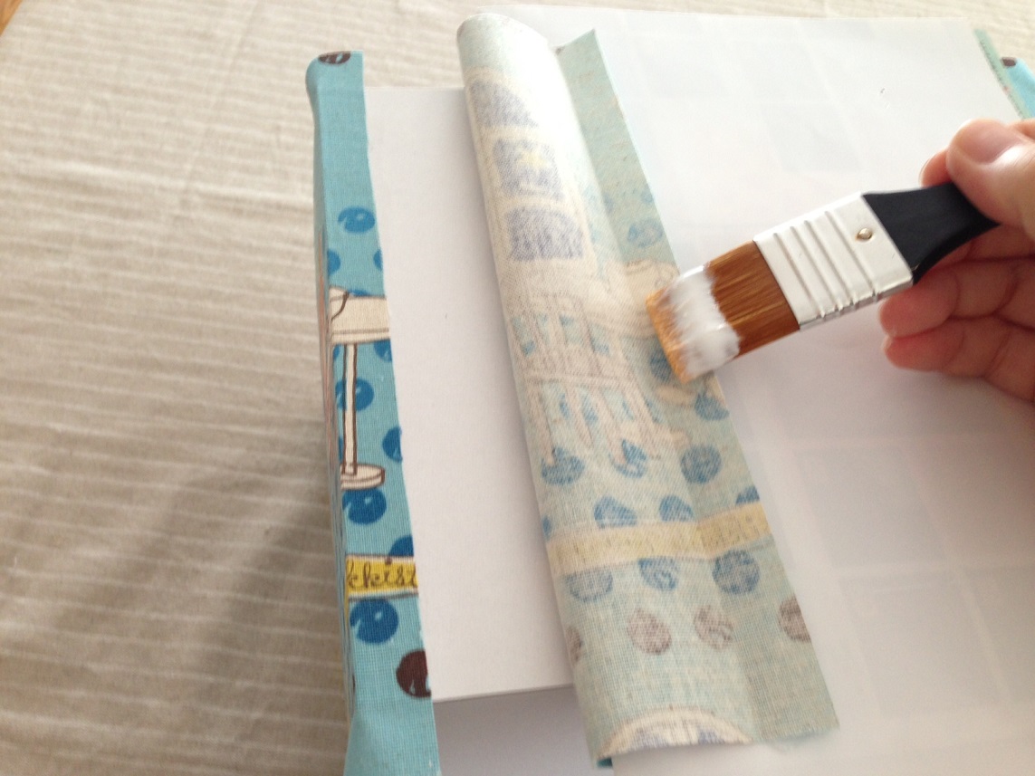 ボンドを塗る量がポイントです。 少くないと、生地が貼れずに浮いてしまいますし、多すぎると、生地の表面に染み出してきます。 生地の浮きがないように、しっかりと全体を貼り付けると、キレイに仕上がります。