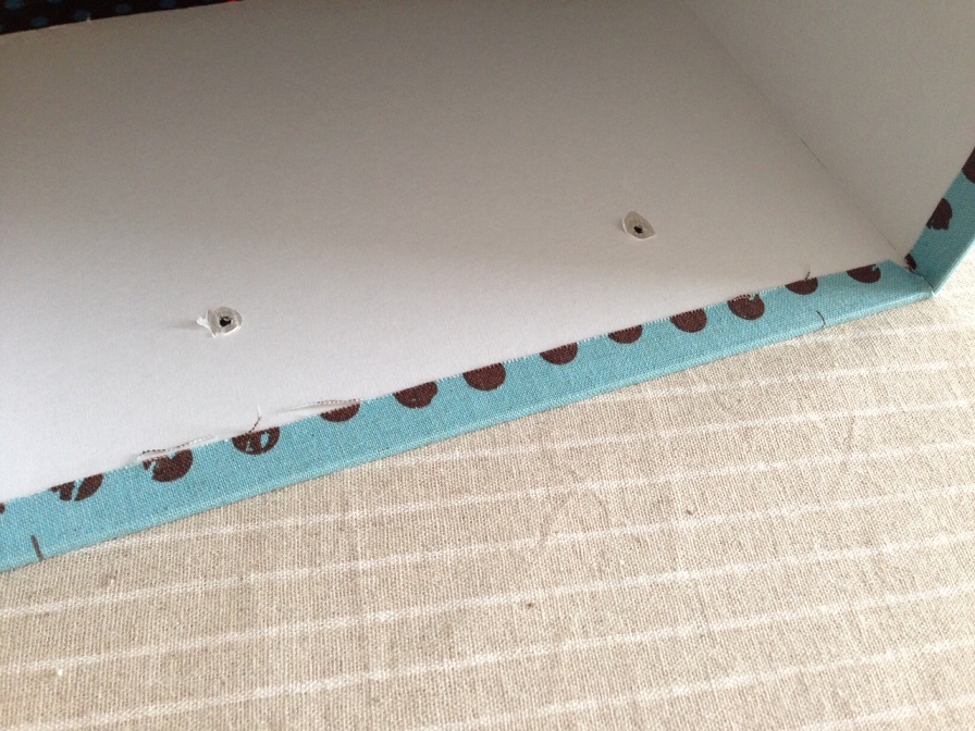 6上部ののりしろを内側に貼る。 これで、外側が完成。最後に取付ける持ち手用に目打ちで下穴を開けておく。