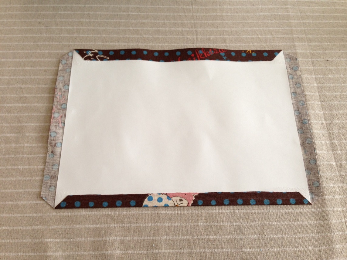 1長側面の内側を一面ずつ貼る。 ケント紙C’にボンドを塗り、生地C”に貼り付け、生地の角を切り落とす。上下ののりしろは、裏面に折り、貼り付ける。それを長側面に貼り付ける。左右ののりしろは、隣の面に開いて貼り付ける。