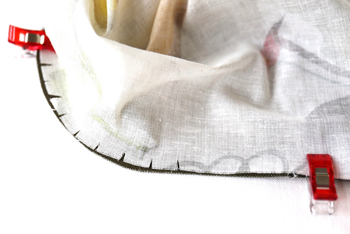 底表布、底裏布のカーブに切り込みを入れ、底の縫い代を内側に折っておきます。
