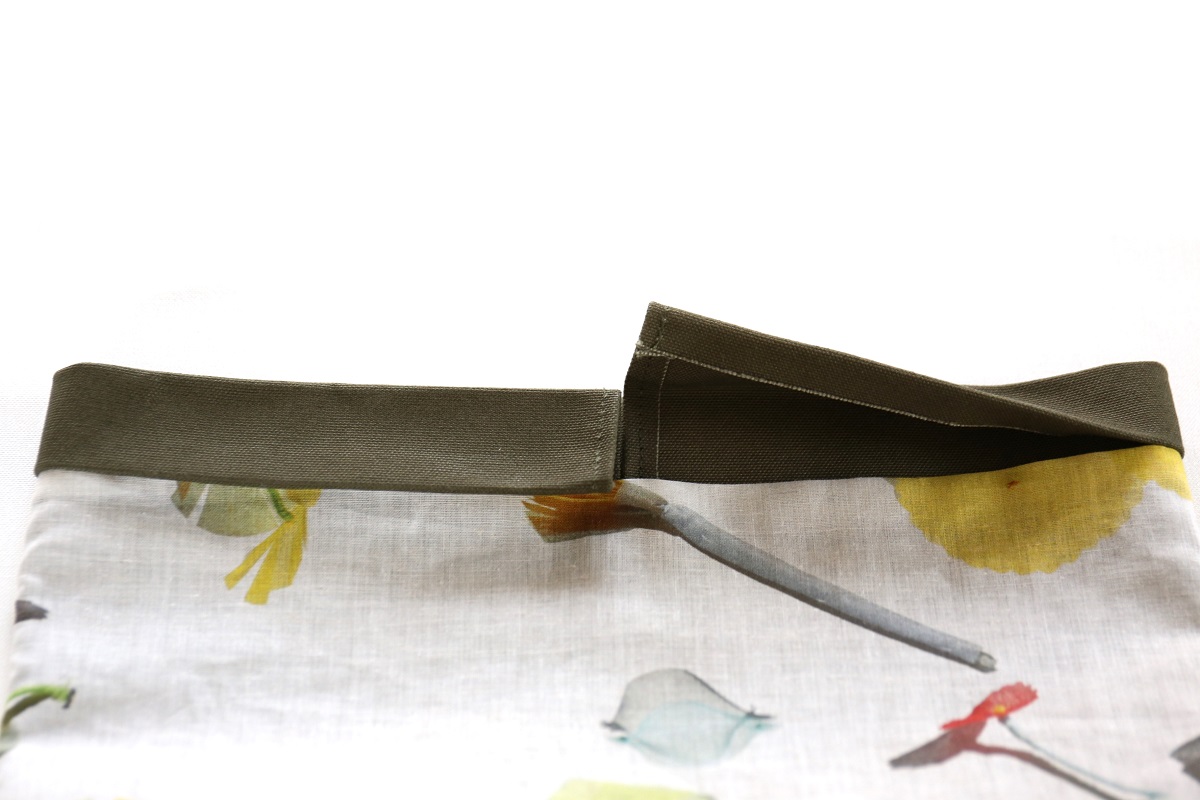 裏袋の口辺を表袋の口辺に1cm重ね合わせます(テープは避けて縫います)。