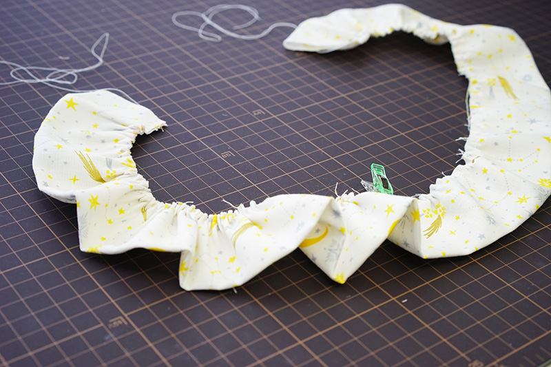 フリルを作ります。両端(短い辺)を5mmほど折り込んでおき、外表で半分に折ります。ミシンの縫い目の長さを長くし、「わ」になっていない側を縫います。(縫い代0.5cm)。下糸を引っ張ってギャザーをよせます。