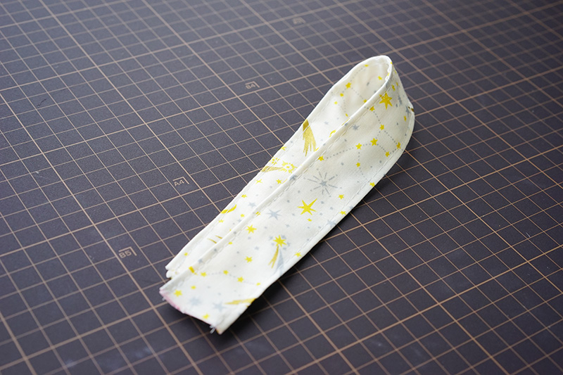 持ち手を作ります。長い辺を1cmずつ内側に折り、外表で半分に折ります。端ミシンをかけます。